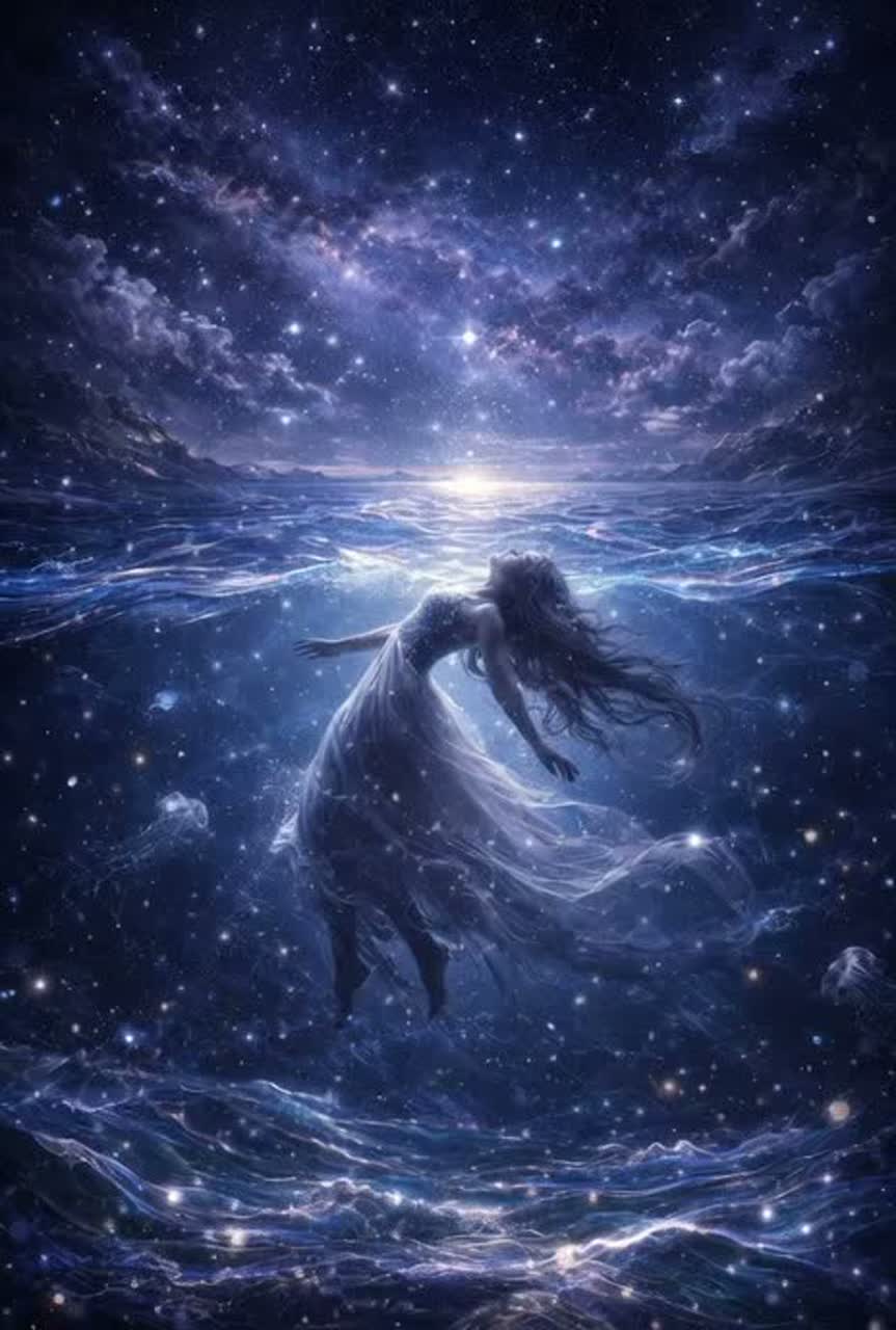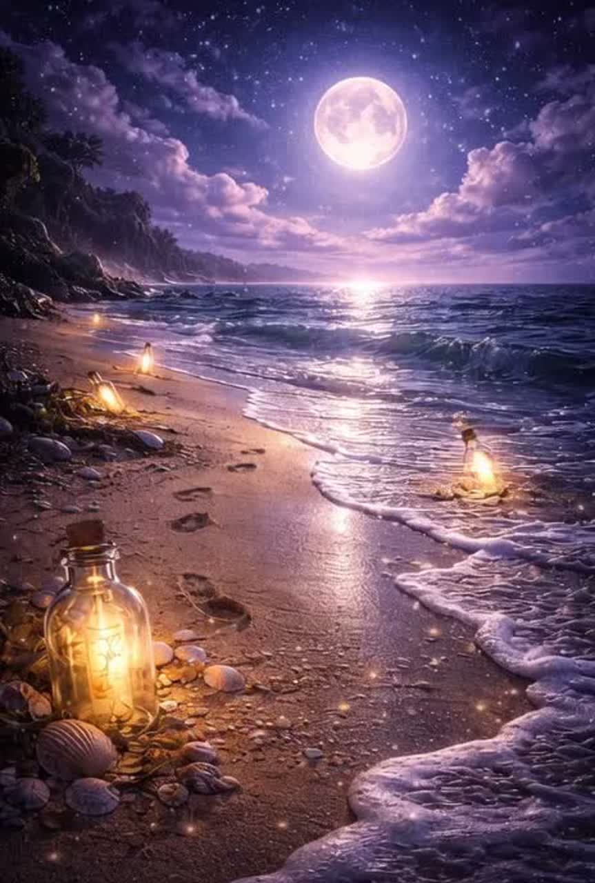 🖼 Imagery: Moonlit shoreline beyond time, dreams washing in like sealed letters, footprints that fade behind you, a horizon that never closes