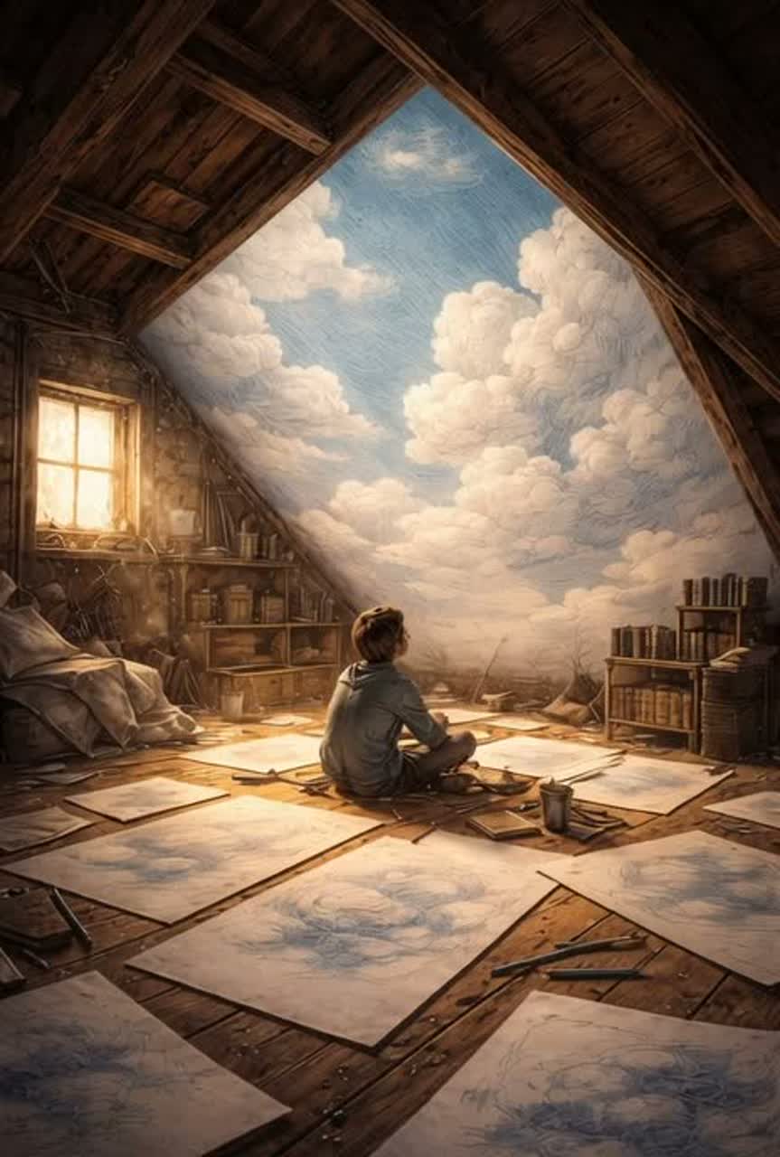 🖼 Imagery: An attic room with slanted ceilings, paper pages spread on the floor, a sky imagined in pencil and hope, clouds drawn where windows can’t open