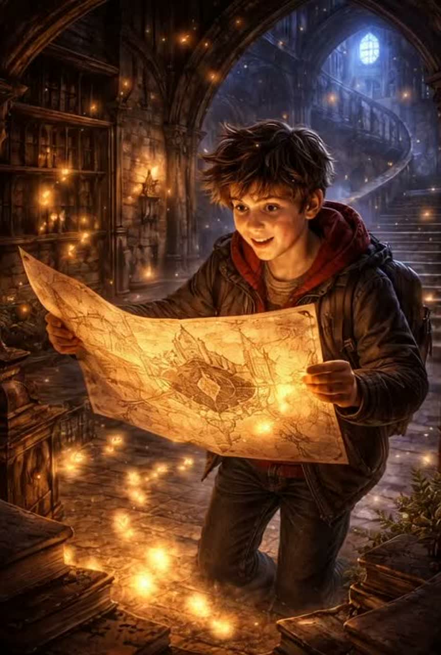 Footsteps flicker into being like fireflies — rooms shifting, staircases twisting, corridors blooming in ink that refuses to stay still, His voice is boyish and bright, half-laughing as he follows secrets only troublemakers and dreamers dare to chase, Tone:
