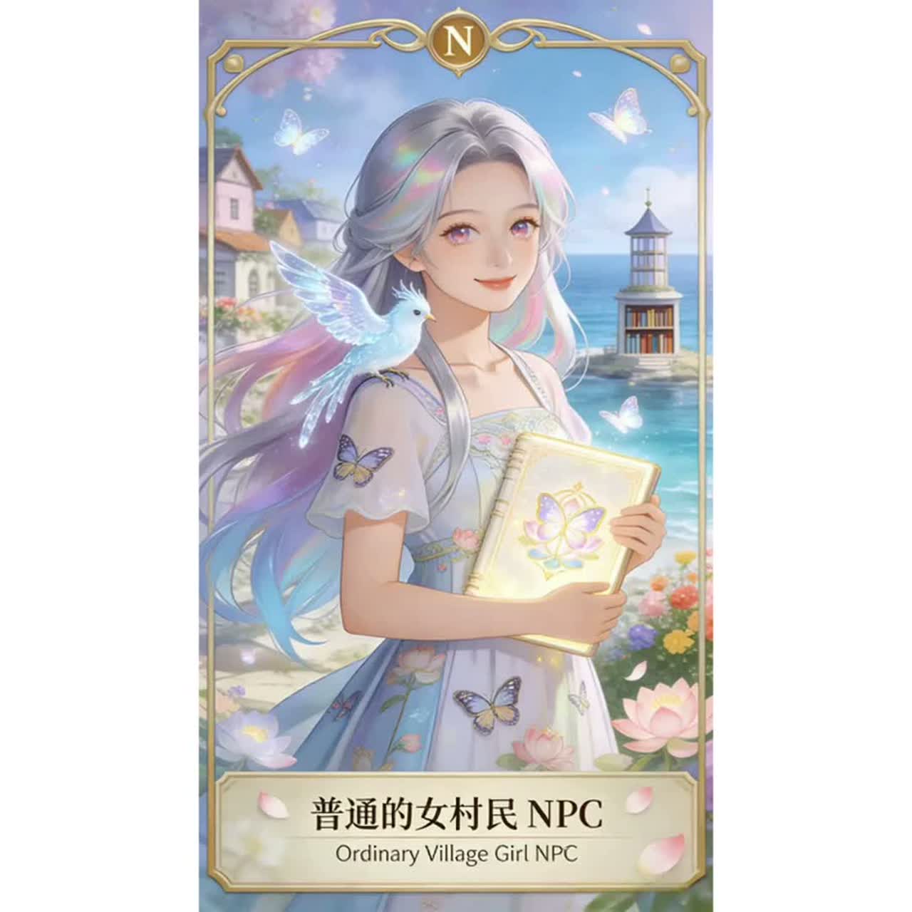 Cinematic fantasy folk ballad, female ethereal vocal, gentle piano intro, warm strings, ocean ambience, dreamy magical atmosphere, narrative storytelling style, slow tempo, clear melodic hook repeating “普通村民 NPC”, focus on emotional chorus and memorable hook