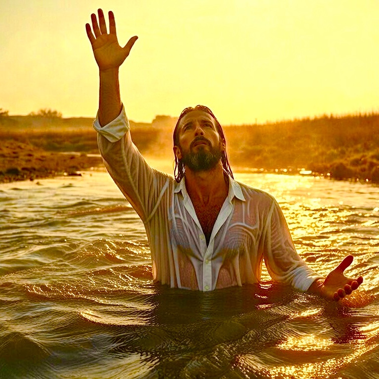 Produce a cinematic Southern-acoustic track titled “Born in the Water”, ~70 BPM, ~4:47 runtime, Core: fingerpicked acoustic guitar with soft ambient room tone and optional subtle creek/wind sounds for a reflective cinematic feel, Lead vocal performed by the persona: ~40-year-old male with long hair and beard, warm, slightly raspy, storytelling Southern grit, natural dynamics, Minimal processing, no heavy reverb, no distortion, no metallic tones, Light harmony in choruses only, Arrangement: four reflective verses, two pre-choruses, extended final chorus, bridge, Emphasize Spirit-baptism theme: rebirth, cleansing, surrender, and walking in new life, Mix balanced, warm, intimate, cinematic, emphasizing emotional depth without over-polish