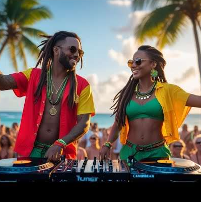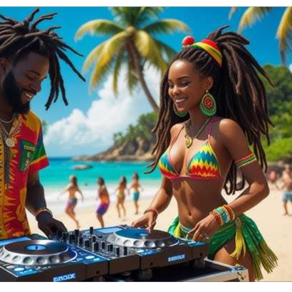 A catchy melody mixed with a futuristic summer vibe, brutal electronic sound combined with reggae singing, a nostalgic-sounding beach tune, futuristic and electronic sound blended with reggae sound