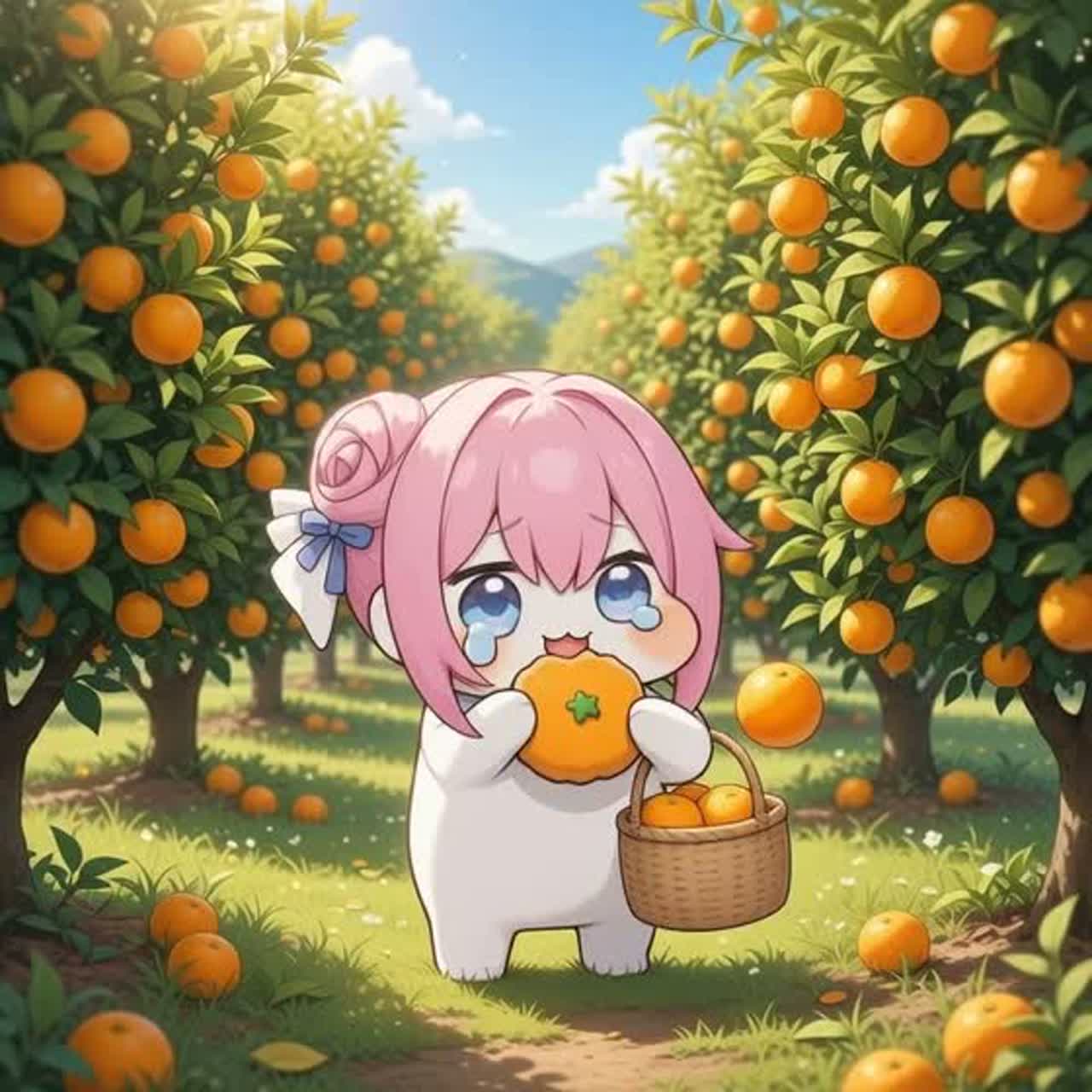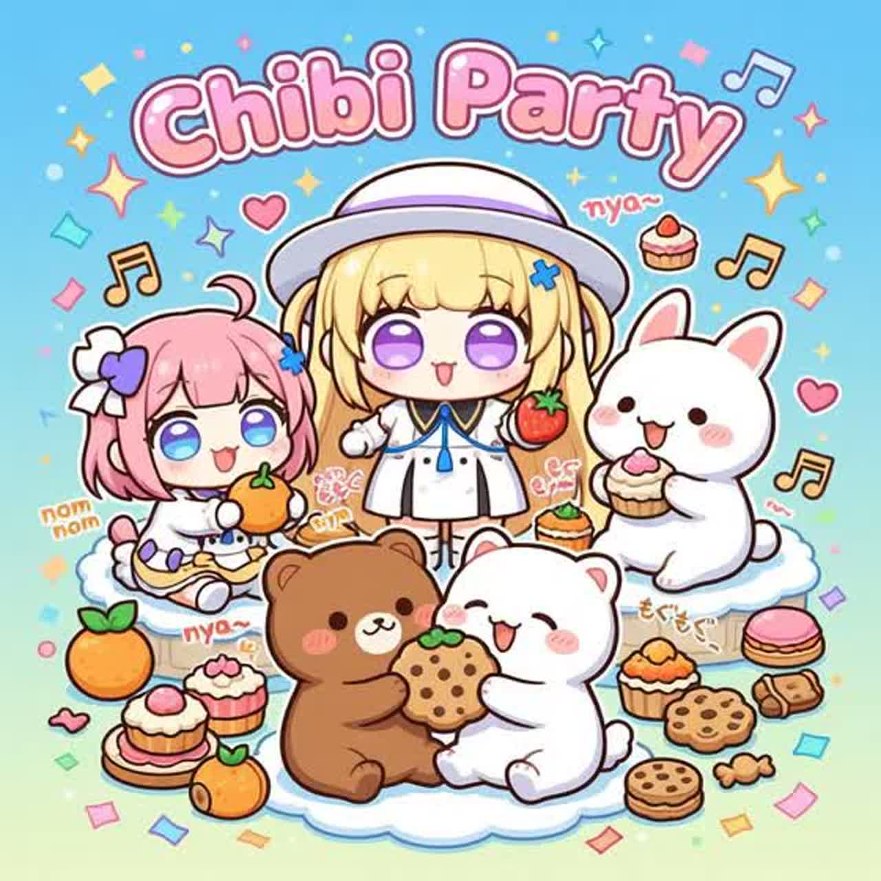 Cute kawaii hyperpop, chiptune, bubblegum J-pop, K-pop aegyo vocals, Chinese meme pop, 8-bit game sounds, playful synth bells, toy piano, plucky bass, bouncy dance beat (140–160 BPM), short looping hook structure, bright sparkly synths, cartoon sound effects, snack eating sounds (nom nom, crunch, slurp), giggles, “nya” and “chi chi” voices, layered cute vocal chants, High-energy TikTok meme style with super catchy repetitive chorus, designed for 15–30 second loops, chaotic but adorable