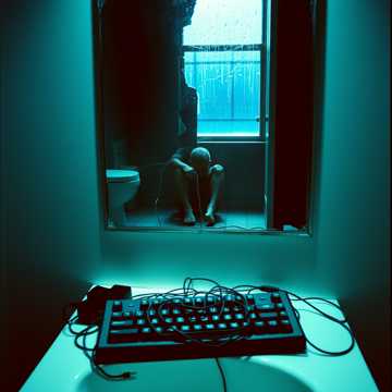 Dark Ambient Trap, Glitch, Sub-bass heavy, Arpeggiator 80s, Cathedral Reverb, Ethereal male vocal, Holding back tears, bpm: 96