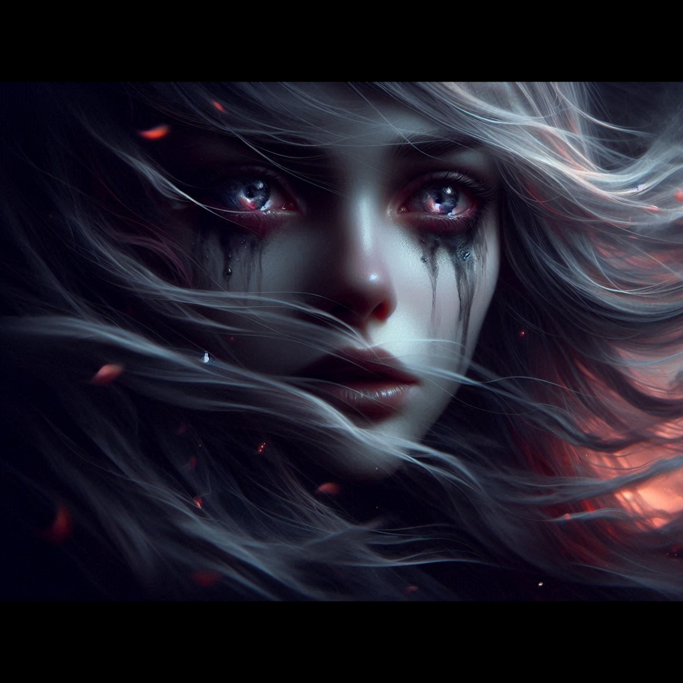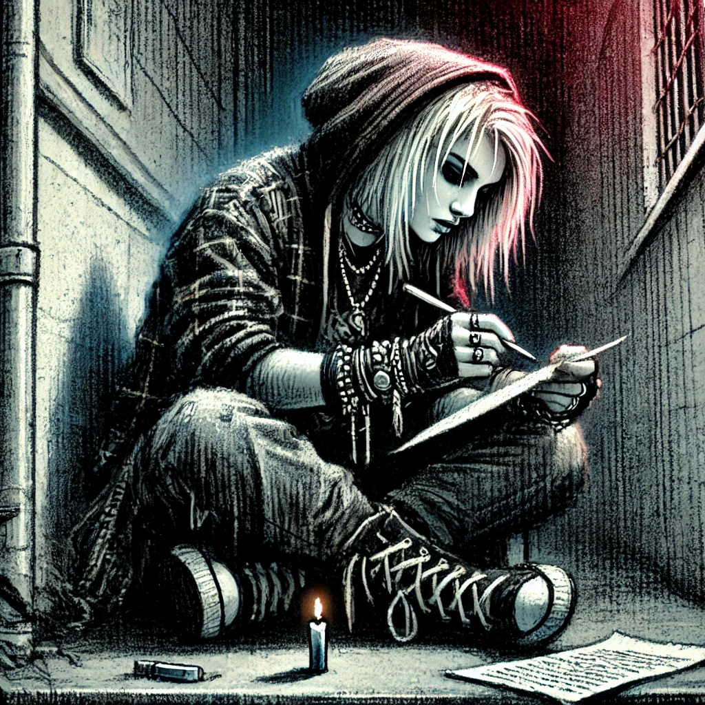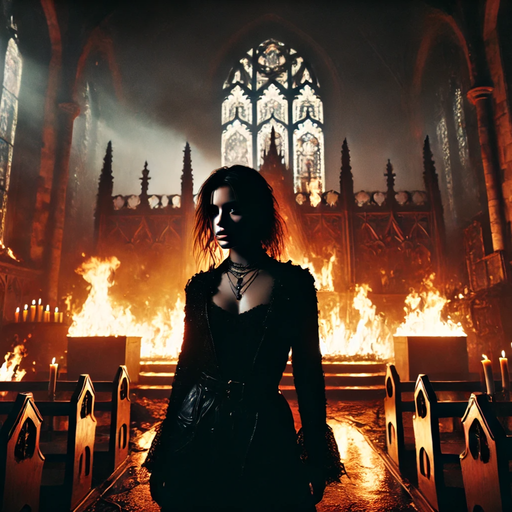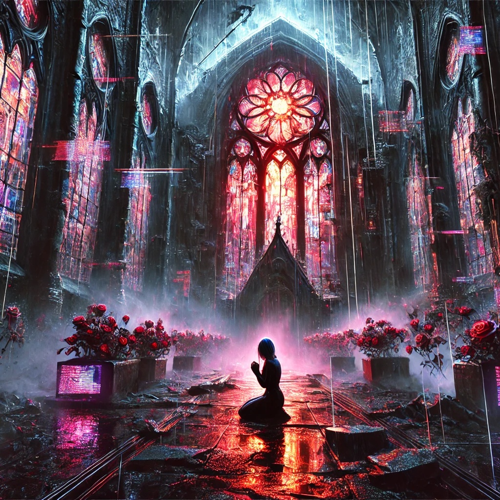 Youthful female voice, Gothic rock, raw emotional, dramatic, Dark Cinematic Ballad, Fierce, questioning, tragic beauty, Background whispers, echoed lines, light glitch FX, haunting, strong