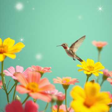 Bright, delicate instrumental piece evoking a hummingbird in rapid motion, hovering and darting among flowers, Prominent piccolo and high flute carry fast, shimmering melodic lines, with harp glissandi or plucked celesta providing sparkling accents, Tiny plucked strings and light shakers or triangle add rhythmic energy without grounding the motion, Tempo very fast, around 140–160 BPM, with rapid trills, fluttering motifs, and sudden directional shifts to mimic hovering, darting, and agile flight, Harmonic palette: light, major, sparkling, with occasional chromatic runs for quick movement, Mood: energetic, agile, whimsical, and radiant