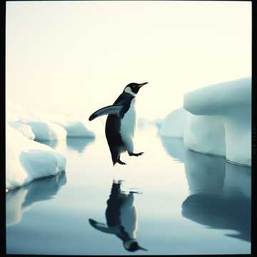 Playful yet elegant instrumental piece evoking a penguin moving between land and water, On land: pizzicato basses and low strings create a quirky, waddling rhythm; light percussive taps or brushes accentuate footfalls, Underwater: harp, celesta, and flowing strings take over for smooth, gliding melodic lines, suggesting graceful swimming, Tempo variable: moderate, 80–100 BPM on land; slower, flowing sections 50–65 BPM underwater, Harmonic palette: mostly major with light chromatic shifts for curiosity and playfulness, Mood: whimsical, agile, curious, and fluid, with contrasts between comical land movement and serene underwater motion