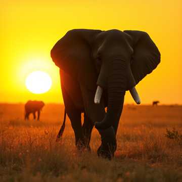 Epic, powerful instrumental piece evoking a majestic African elephant moving through the savannah, Prominent deep African percussion: djembe, dunun, congas, and low toms provide weighty, interlocking rhythms, Timbales, shakers, and subtle hand percussion add texture without breaking the massive, ponderous feel, Low strings, tuba, and contrabass trombone carry slow, broad, legato melodies suggesting size, strength, and intelligence, Occasional muted brass or horn calls echo like elephant trumpets, Tempo moderate, 60–80 BPM, emphasizing stately procession and measured steps, Harmonic palette: rich, warm, slightly modal for African tribal flavor, Mood: enormous, wise, grounded, intelligent, dignified, and connected to the land