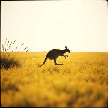 Bright, lively instrumental piece evoking a wallaby or kangaroo hopping across the sunlit outback, Prominent plucked strings (pizzicato violins and cellos) and marimba create springy, bouncy motifs, Add light percussion: soft snare brushes, hand drums, and shaker rhythms to reinforce playful, rhythmic hopping, Occasional woodwind flourishes (flute, clarinet) mimic quick head turns and alert curiosity, Tempo fast, around 110–130 BPM, with short, leaping melodic phrases and offbeat accents to convey unpredictable jumps, Harmonies cheerful, major, slightly quirky, Mood: playful, energetic, agile, alert, and lively