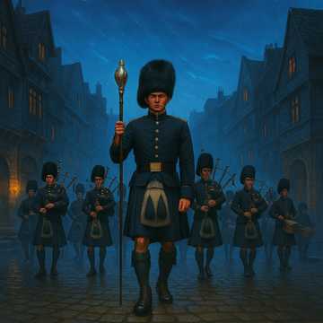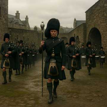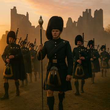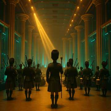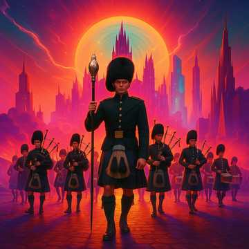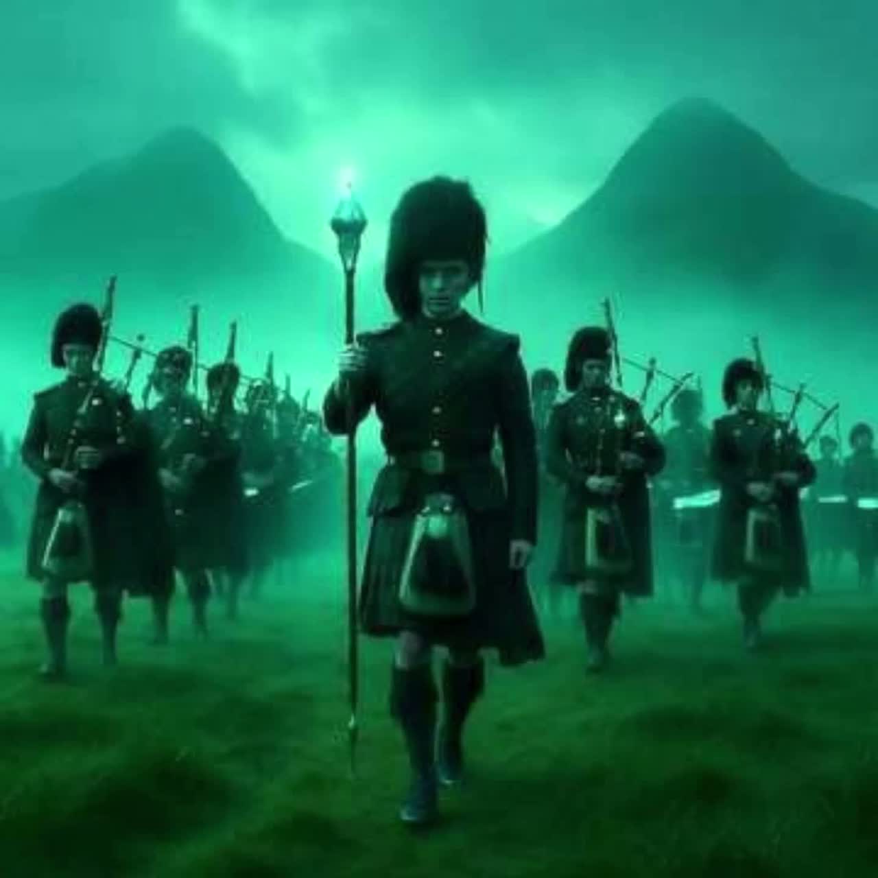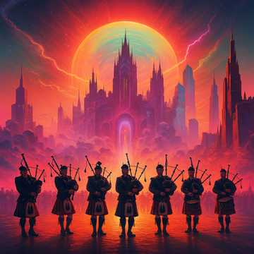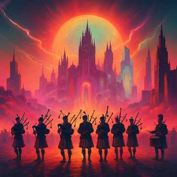 Pipe Band x Cinematic EDM Hybrid โ Deep sub-bass drums and sharp snare rudiments fused with layered Highland bagpipe drones and very high-frequency melodic pipe sprinkles, Dynamic contrasts and tempo shifts drive the emotional arc: from slow, sparse ceremonial cadences to full-speed marching energy with EDM-infused pulse, Traditional military rhythms meet modern cinematic bass design, Spacious, atmospheric pads allow breathing room for the pipes, which lead the arrangement with shimmering, high melodic accents, The overall vibe balances tradition and innovation โ a modern epic march with pulsating depth and high-end brilliance, Break in the melody with short but intensive drum solos covered by spheric sound