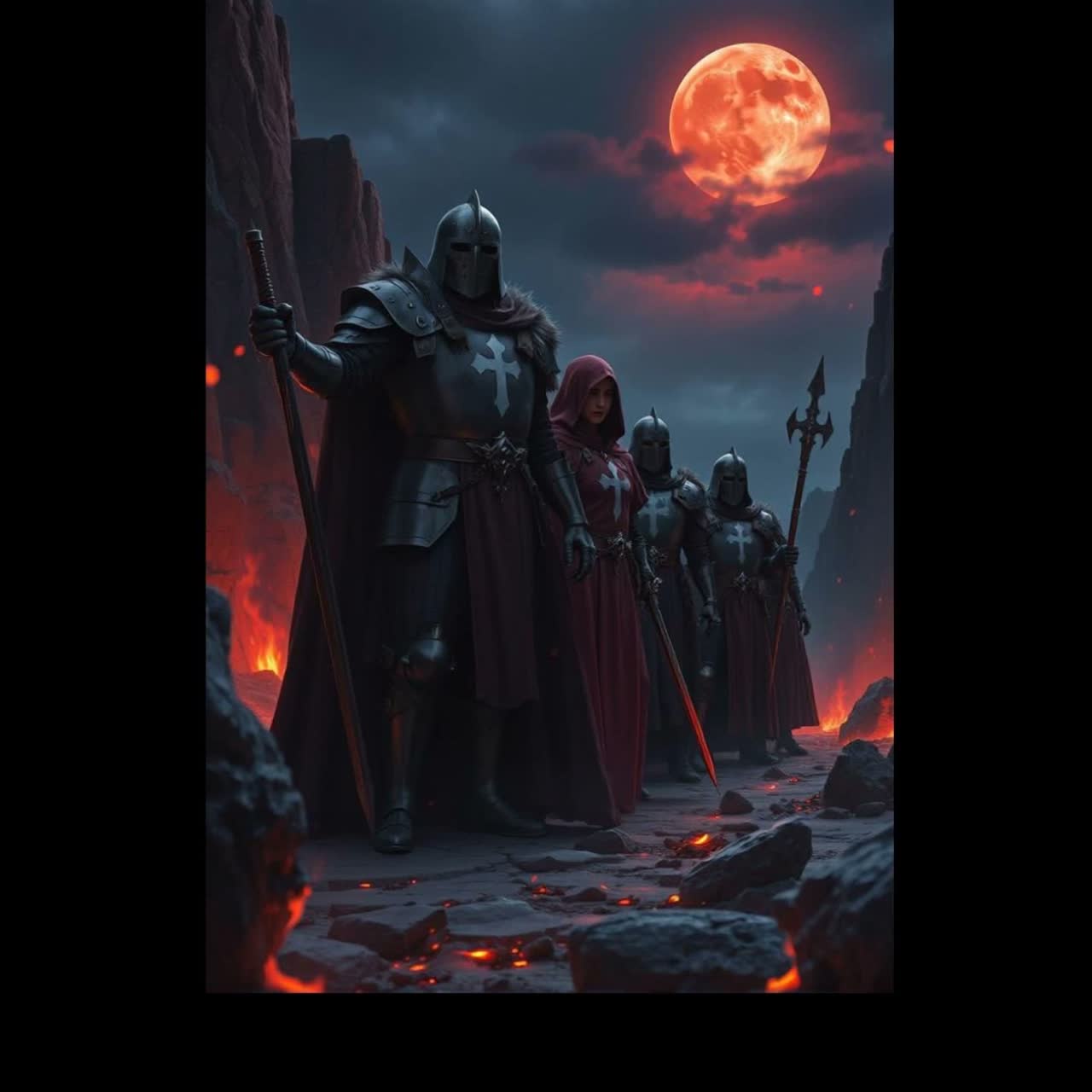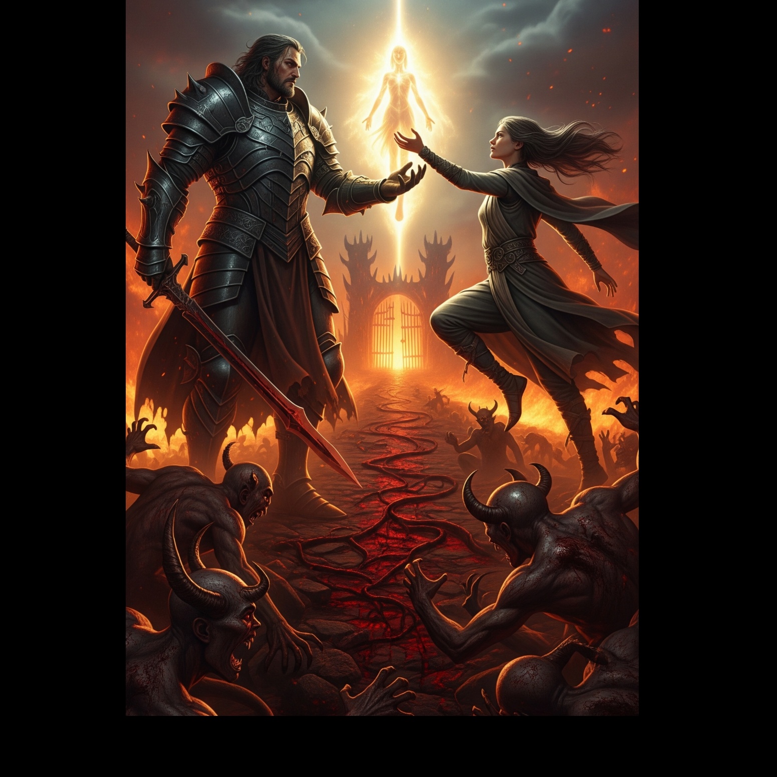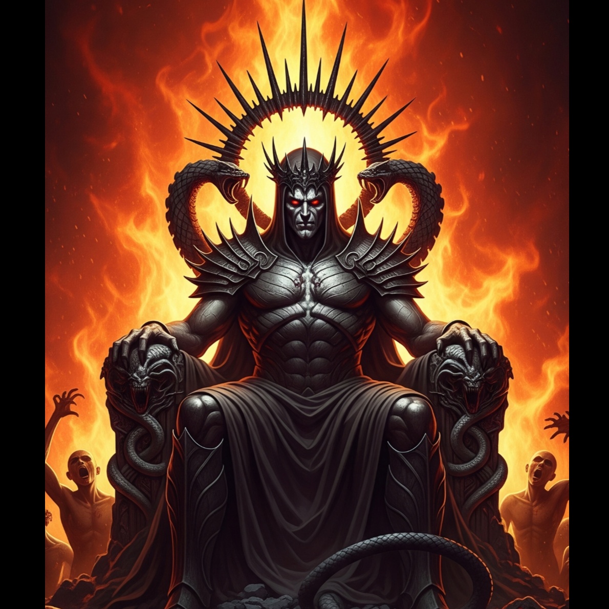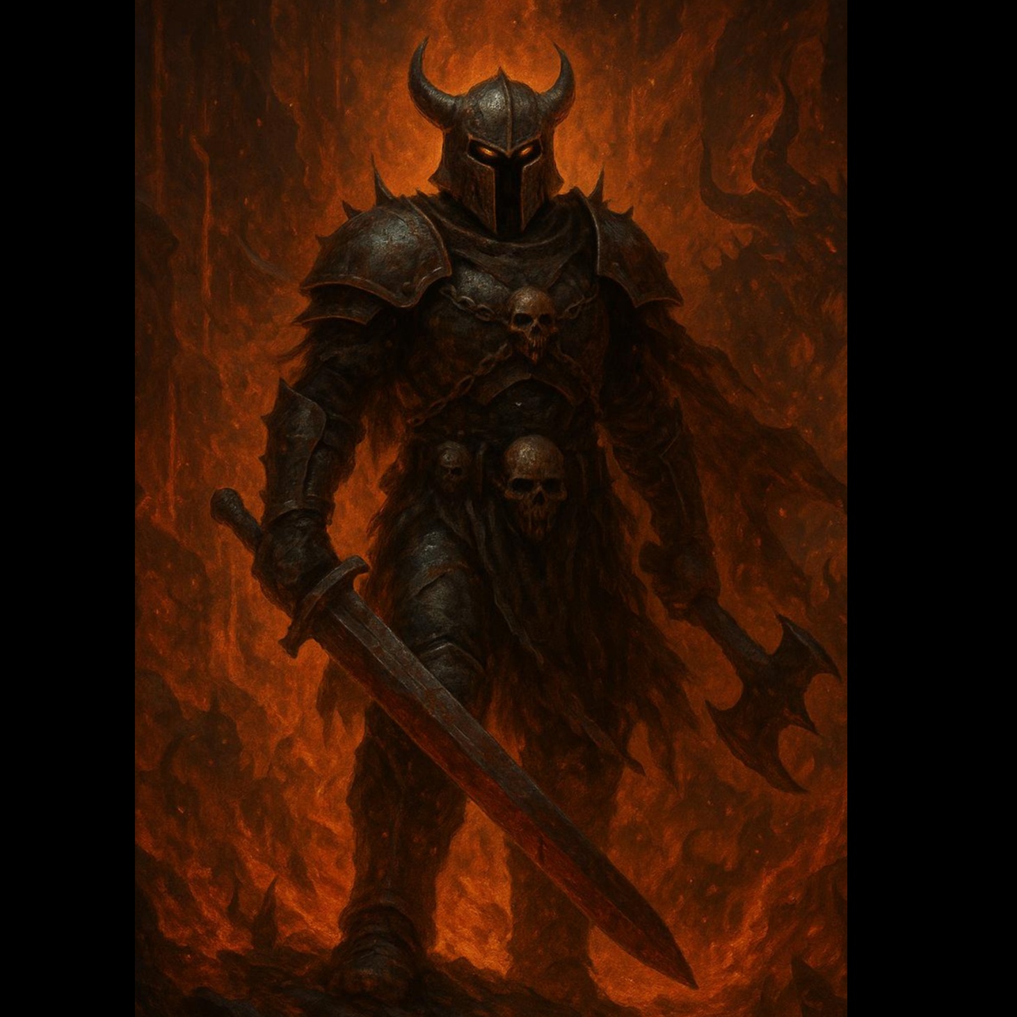 Create a dark and cinematic metal track with an epic and infernal atmosphere, The music should combine heavy, down-tuned guitars with slow to mid-tempo double bass drums and powerful tom-driven rhythms, Add atmospheric synth layers and choirs for a dramatic, apocalyptic feel, The tone should be oppressive and heroic—evoking fire, chaos, and defiance—like a descent into a mythic underworld, Include occasional dissonant chord shifts, minor-key melodies, and a soaring bridge section with layered instrumentation, Ideal for a mix between doom, epic metal, and gothic orchestration, Keep the arrangement dynamic and story-driven, with a strong instrumental climax