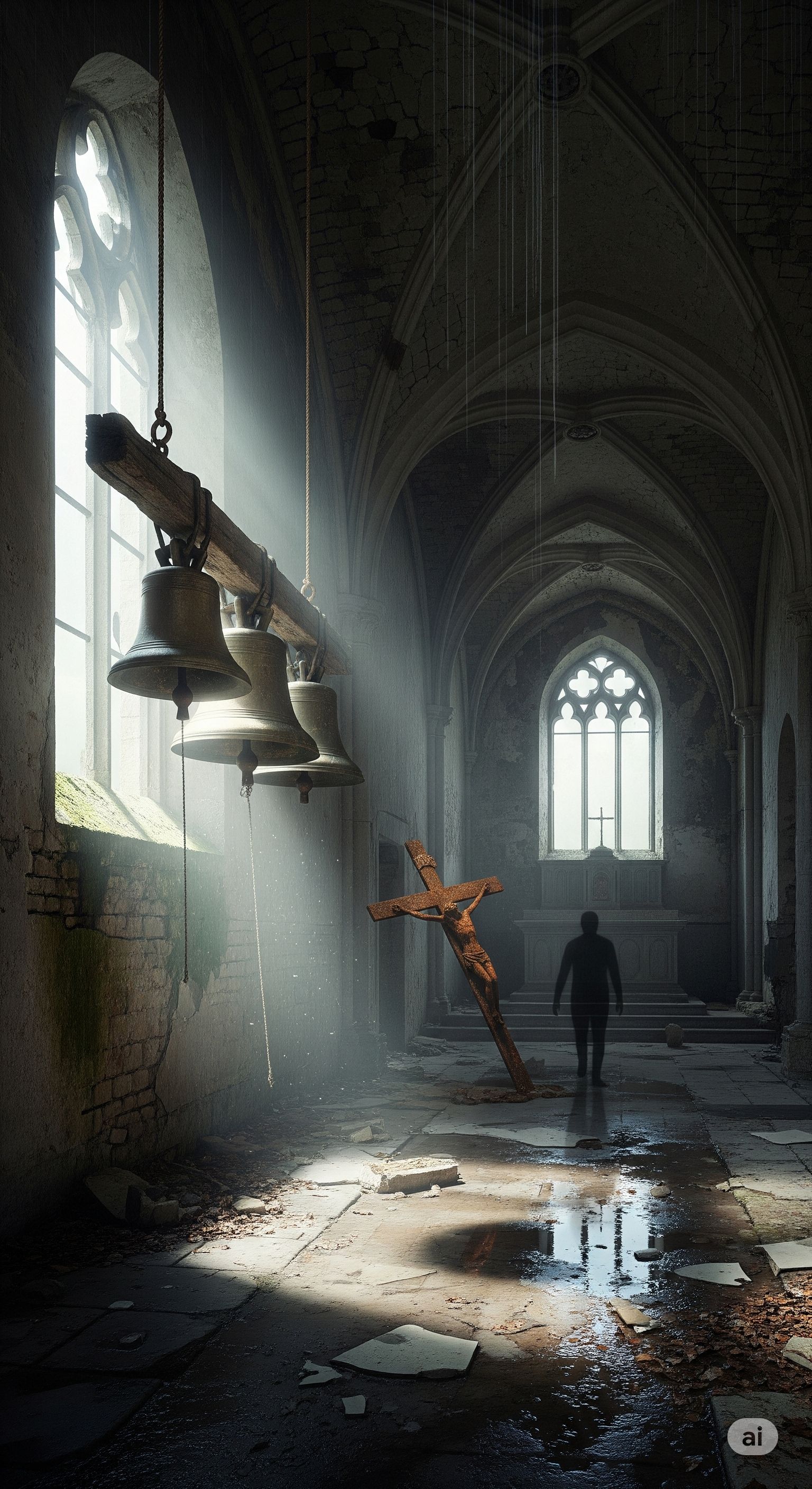 A slow, heavy doom rock track with thunder and rain sound effects, opening with distant church bells tolling three times — deep, echoing, and ominous, The guitar riff is based on the tritone interval, creating a dark, dissonant, almost unholy atmosphere, Tempo is sluggish and dragging, driven by distorted guitars, minimalistic but pounding drums, and a bassline that feels like it's pulling the soul down, The vocals are mournful and theatrical, filled with dread, occasionally rising into dramatic cries like “Oh nooooo…”, full of anguish and despair, The overall tone is oppressive, gothic, and haunting — like a funeral procession under a storm