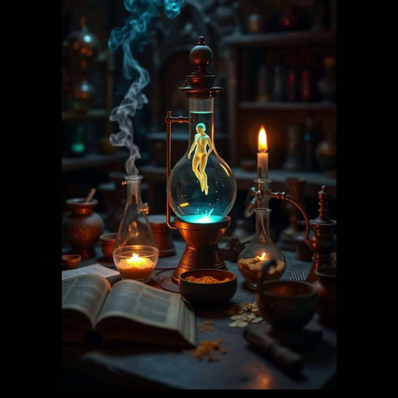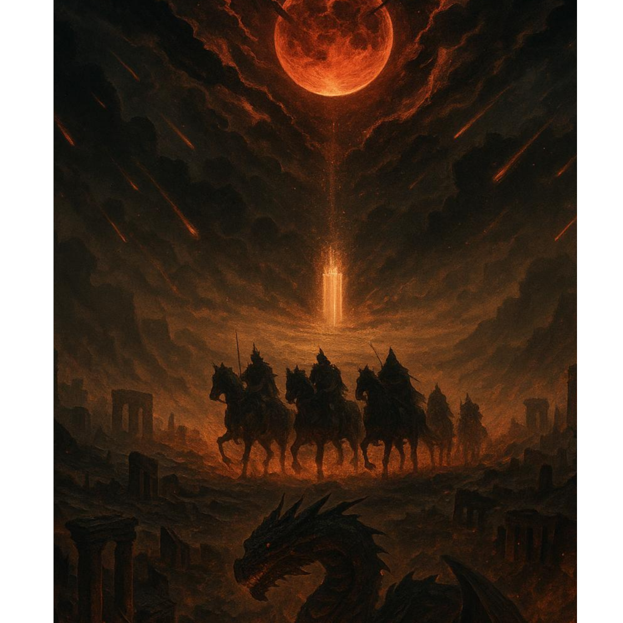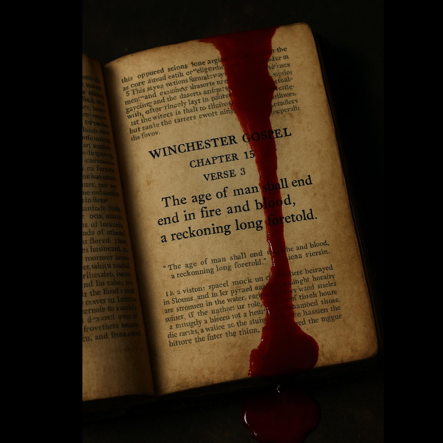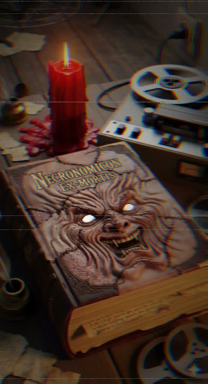 Dark Metal with cinematic horror elements, Heavy guitars, pounding drums, ominous choirs, Slow to mid-tempo, ritualistic, apocalyptic atmosphere, Spoken word passages (with echo/reverb, some distorted) as if read from an ancient book, Mood / Imagery: