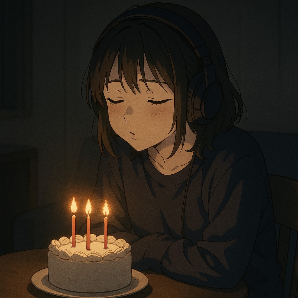 "A melancholic Japanese rap-style birthday song performed by a soft yet expressive female rapper, The lyrics reflect a bittersweet mood, as she celebrates her birthday alone, reminiscing about past memories and lost connections, The beat is lo-fi and emotional, with a slow tempo and subtle trap elements, The chorus features a melodic hook inspired by the classic 'Happy Birthday to You' tune, reimagined with layered vocals and dreamy synths, The overall vibe is introspective, poetic, and heartfelt, "