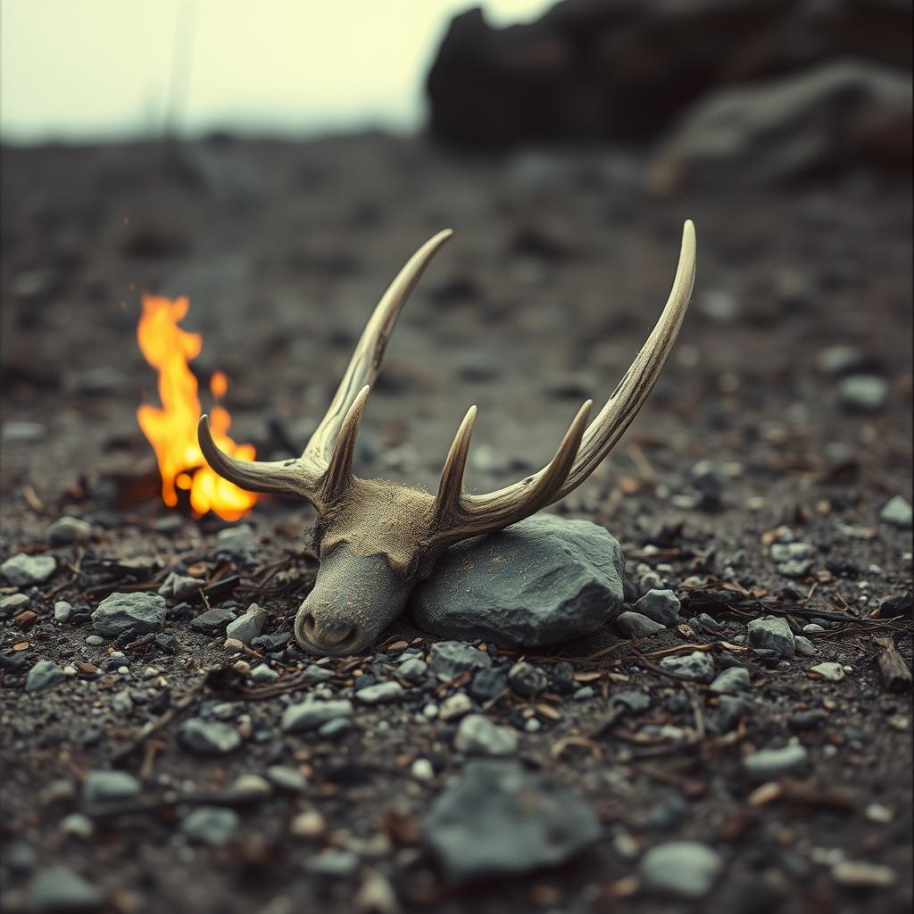 Sparse cinematic ritual with dry frame drums, muted cello harmonics, plucked strings, deep wood percussion, and layered throat-like vocal tones, Echoes move like ash swirling in still air, No ambient softness – only structured void, A meditative yet grounded rhythm pulses from within antler-bone memory