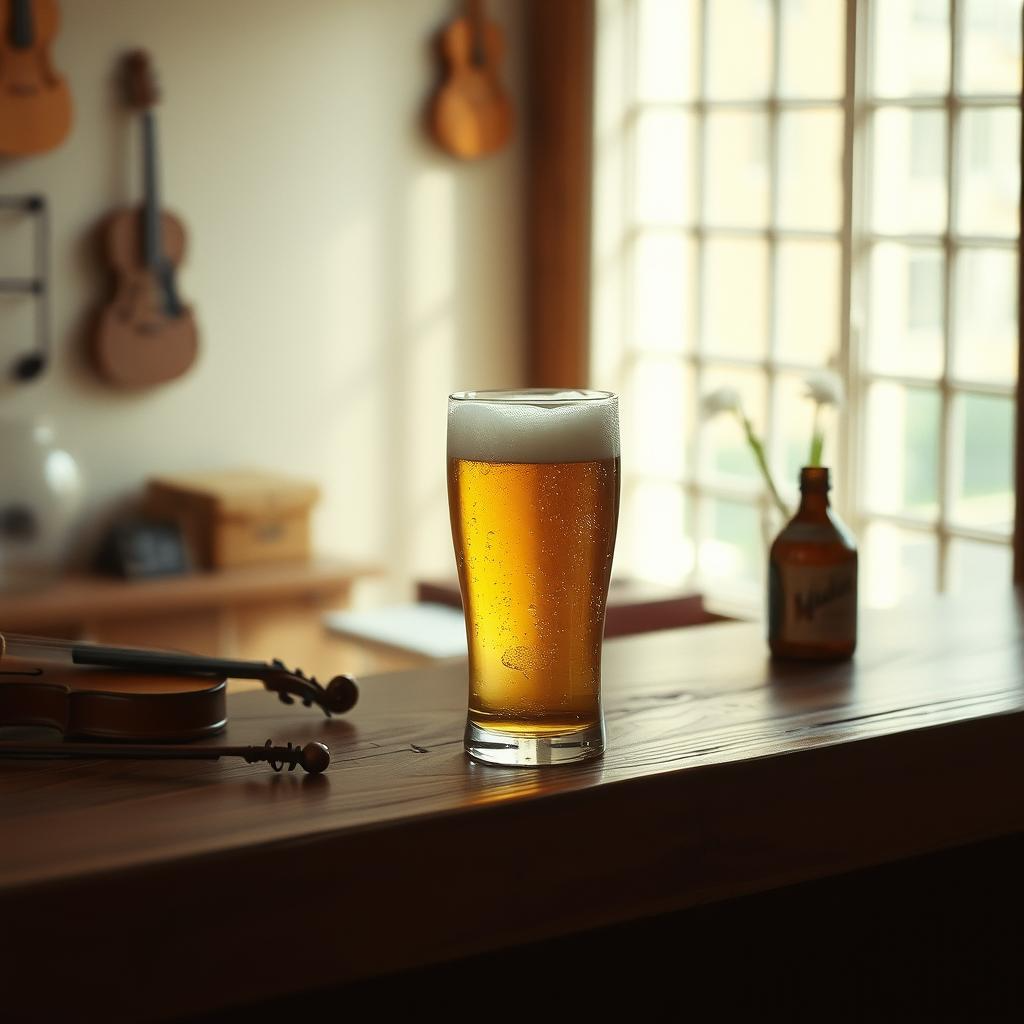 Theme: A quiet afternoon at the Czech Pavilion during Expo Osaka, The protagonist drinks a Hladinka-style beer, noticing the foam, the glass, and the bartender’s pride, The taste evokes distant kindness, and the memory lingers like a soft melody, Keywords: Czech Pavilion, Hladinka, beer foam, gentle bitterness, Expo Osaka, Czech pride, quiet kindness, acoustic ballad, folk strings, clarinet, female vocal