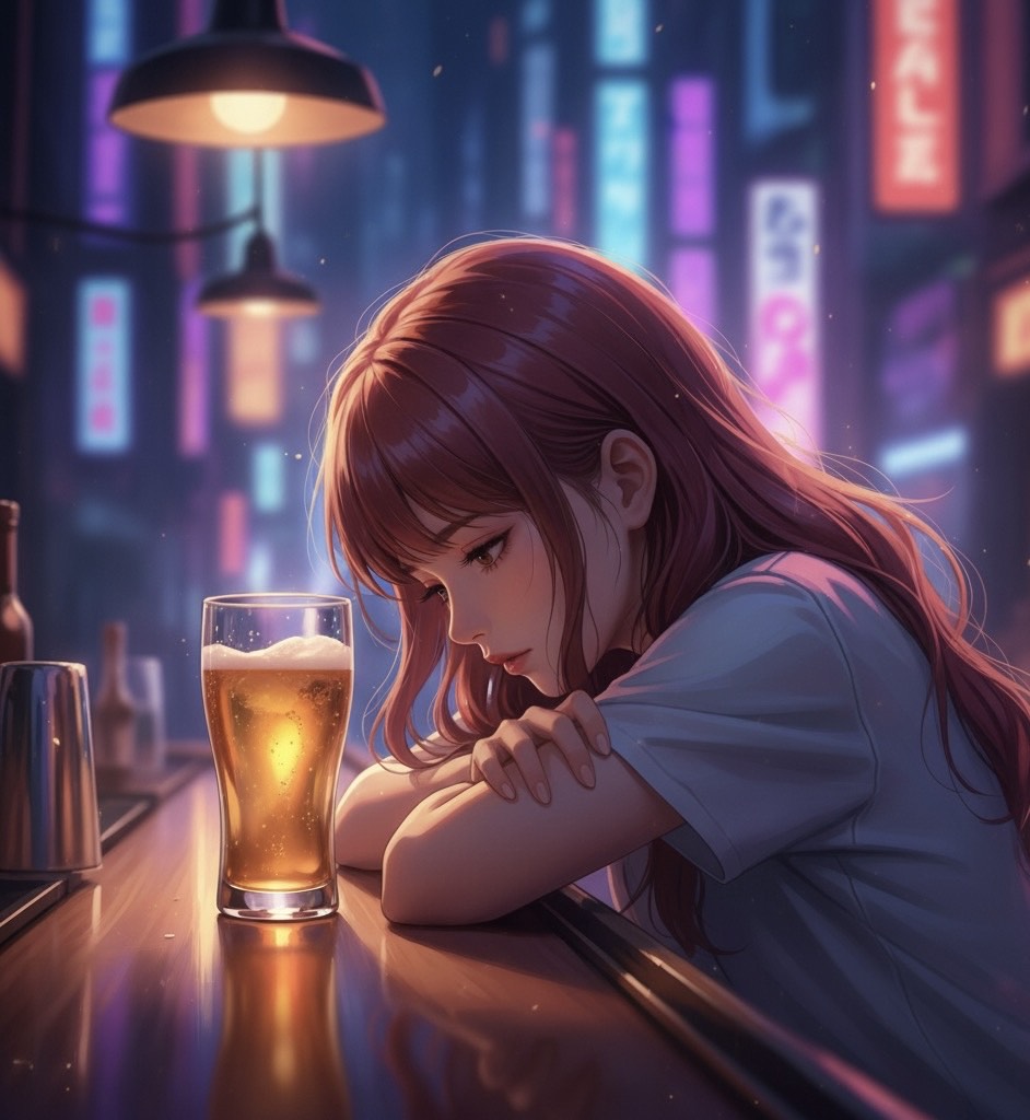 Melodic and emotional liquid DnB with elements of future jazz and downer pop, Smooth and cinematic atmosphere with lush electric piano, warm bass, and flowing drum patterns, Dreamy reverb and multi-layered harmonies evoke the feeling of gentle intoxication, The female vocalist has a powerful, sweet, and emotional voice with beautiful vibrato, The lyrics are about “Shandy Gaff” — a bittersweet drink that mixes beer and ginger ale, symbolizing a love that’s both refreshing and painful, A heartfelt, melodic track expressing the warmth, melancholy, and quiet intoxication of a neon-lit night
