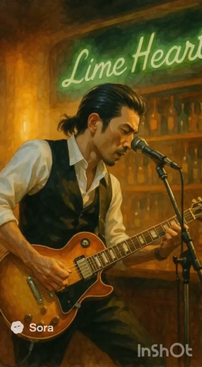 A gritty and stylish Japanese blues rock track infused with funky rhythm and a cool urban edge, The groove combines classic 70s blues swagger with a modern indie rock vibe, similar in energy to early 2000s British rock clubs at night, Electric guitars are warm and slightly distorted, playing tight, syncopated riffs with short, punchy rhythm accents, The bassline is funky and melodic, locking tightly with crisp live drums that swing between shuffle and straight beats, Occasional organ or electric piano fills add smoky atmosphere, The tempo is around 112 BPM — energetic but moody, perfect for a late-night bar scene, Vocals are raspy, soulful, and mature — a lived-in voice that tells stories of love, alcohol, and city nights, Lyrics are in Japanese with some English phrases, listing drinks and toasting to the night with swagger, Imagine a smoky bar called “Lime Heart, ” warm amber lights reflecting on whiskey glasses, and a charismatic singer performing on stage as the night deepens, The m