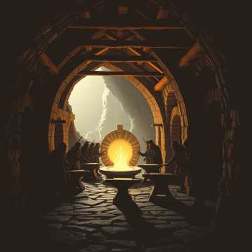 Dwarven miner tavern stomp music, moderate to upbeat tempo, heavy and earthy tonal center, joyful yet rugged atmosphere, No vocals, no lyrics, Instrumentation features deep frame drums, synchronized boot stomps, anvils, hammers on stone, low fiddle, hurdy-gurdy, bagpipe drones, and rough wooden flutes, Sound psychology emphasizes camaraderie, resilience, and hard-earned joy, Minor-leaning folk modes with bright resolutions balance grit and cheer, Rhythms are strong, repetitive, and march-like, inviting synchronized stepping, clapping, and table pounding, Stereo image is tight and grounded, evoking an underground stone hall, Tension builds through layered percussion and rising drone pressure, Release comes via powerful unison strikes and return to the main stomp groove, Overall affect is boisterous, warm, and infectious, celebrating labor, brotherhood, and joy beneath the mountain