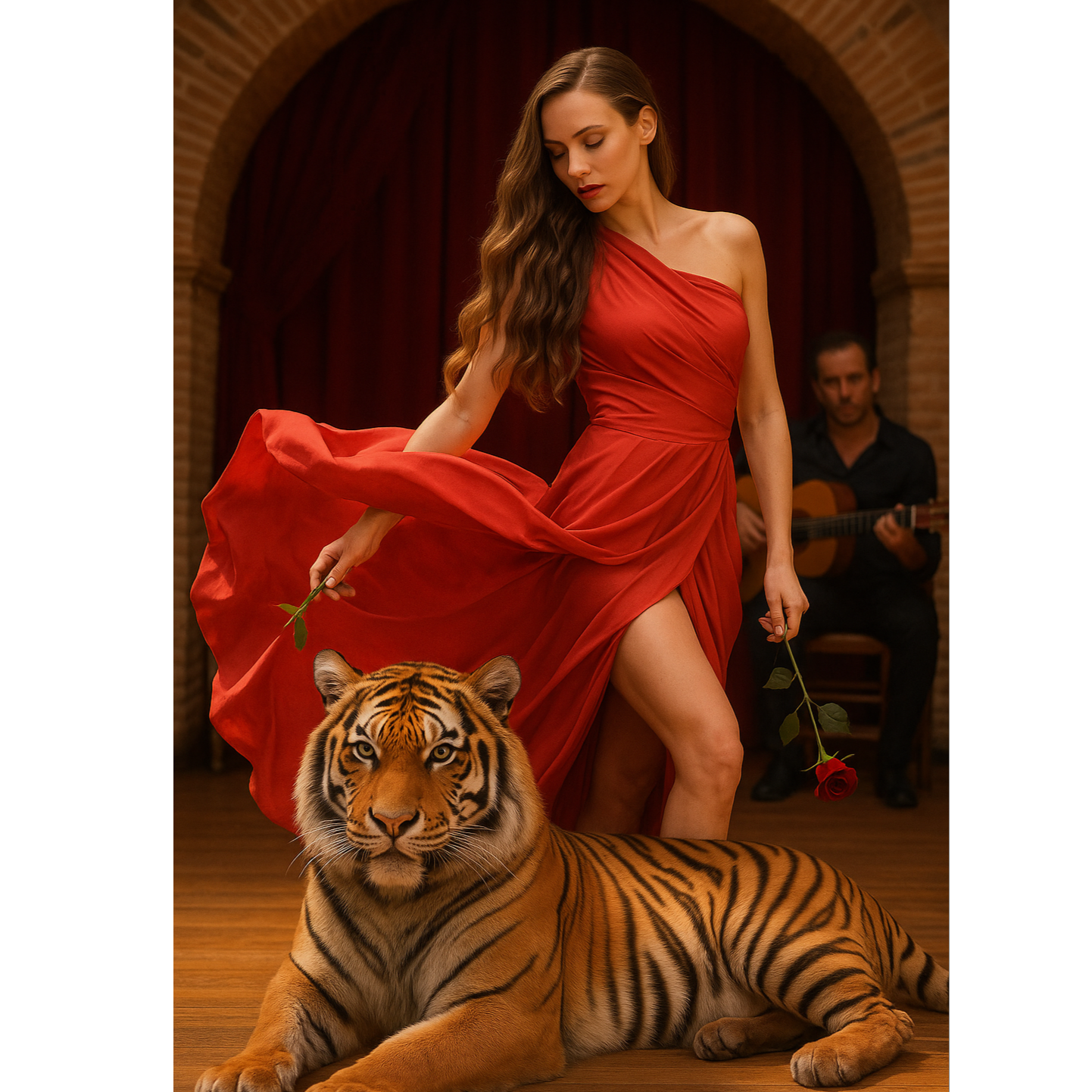 High-energy fusion of flamenco, EDM, and dance, Begin with a deep, pulsing electronic beat and house-style bass, then layer in palmas sordas and syncopated flamenco compΓ‘s, Feature Spanish guitar with passionate rasgueos, fast picado runs, tremolo, and rhythmic golpes, Use an emotive female voice with a warm, slightly raspy toneβstrong and vulnerable, rich in melismas, quejΓos, and expressive phrasing drawn from traditional cante jondo, Include dynamic call-and-response and ornamentation with a modern R&B feel, Process vocals with lush reverb, stereo delay, subtle auto-tune for polish, and harmonized backing for dramatic build-ups, Add synth arpeggios, festival percussion, and filtered drops to intensify the dance energy, Blend organic flamenco roots with electronic textures, evoking the duende of a tablao and the pulse of the club, Tempo: 125β130 BPM, Mood: fiery, hypnotic, soulfulβbridging tradition and modern celebration