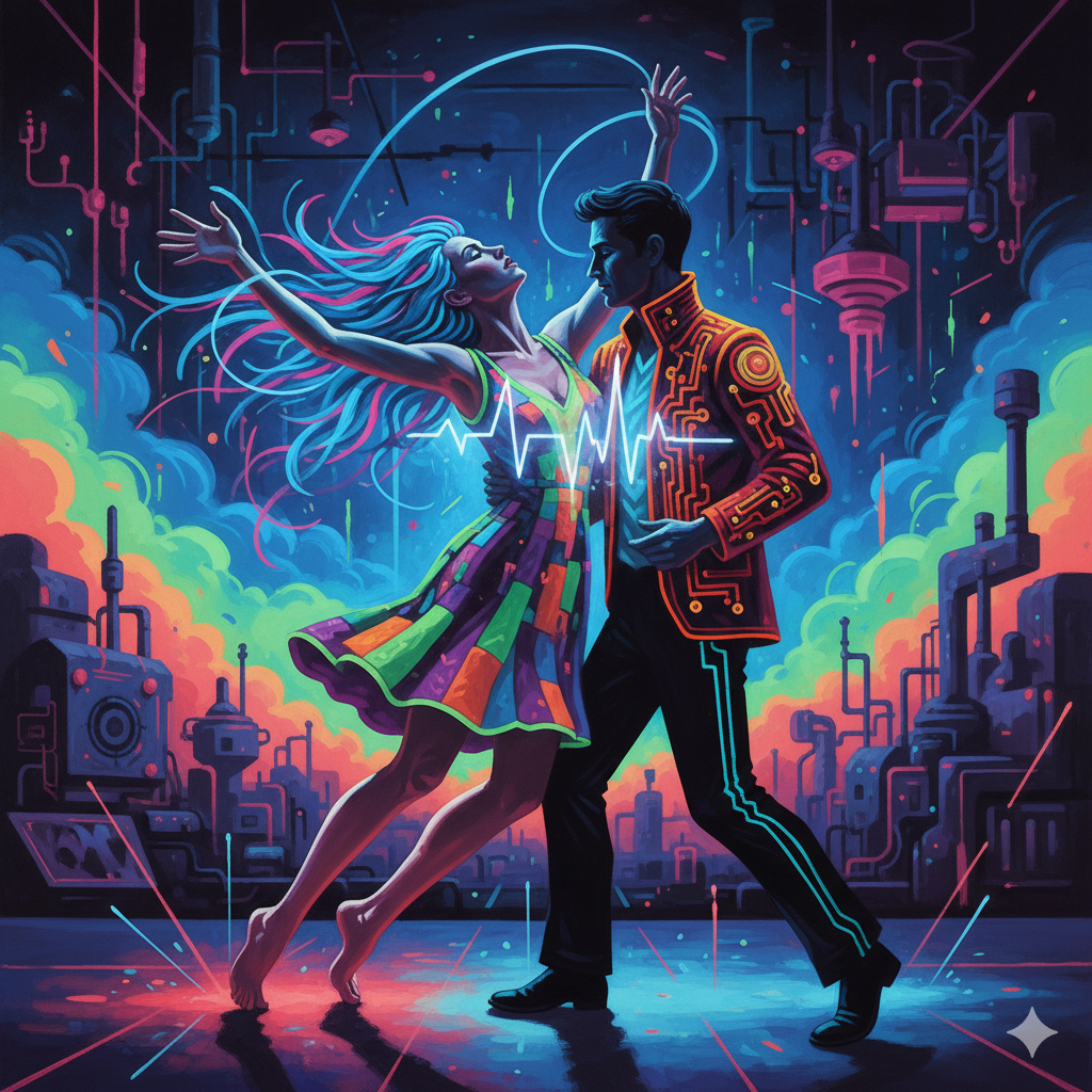 Start with heartfelt indie-pop piano arpeggios over a lush, soulful bed of vintage synths with gentle warmth and mild distortion, Verse features a deep, minimal dark techno beat (120 BPM), robotic vocoder leads, and dreamy, airy chipmunk vocal layers, Chorus builds mood with subtle industrial percussion, layered synth textures, and maintains a psychedelic, rhythmically dark atmosphere within a dreamy electronica-acid jazz blend