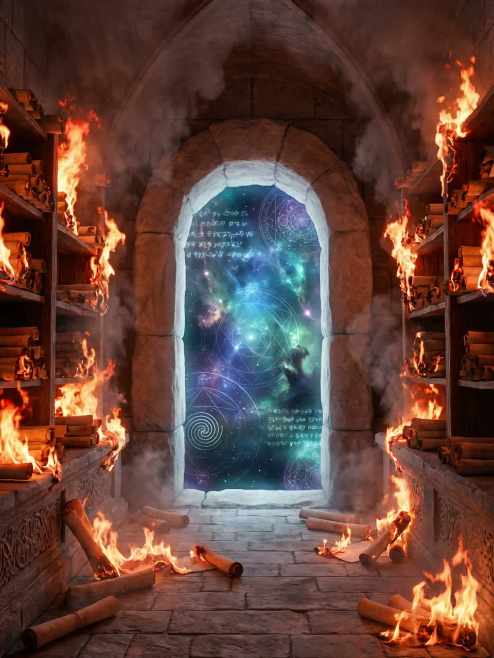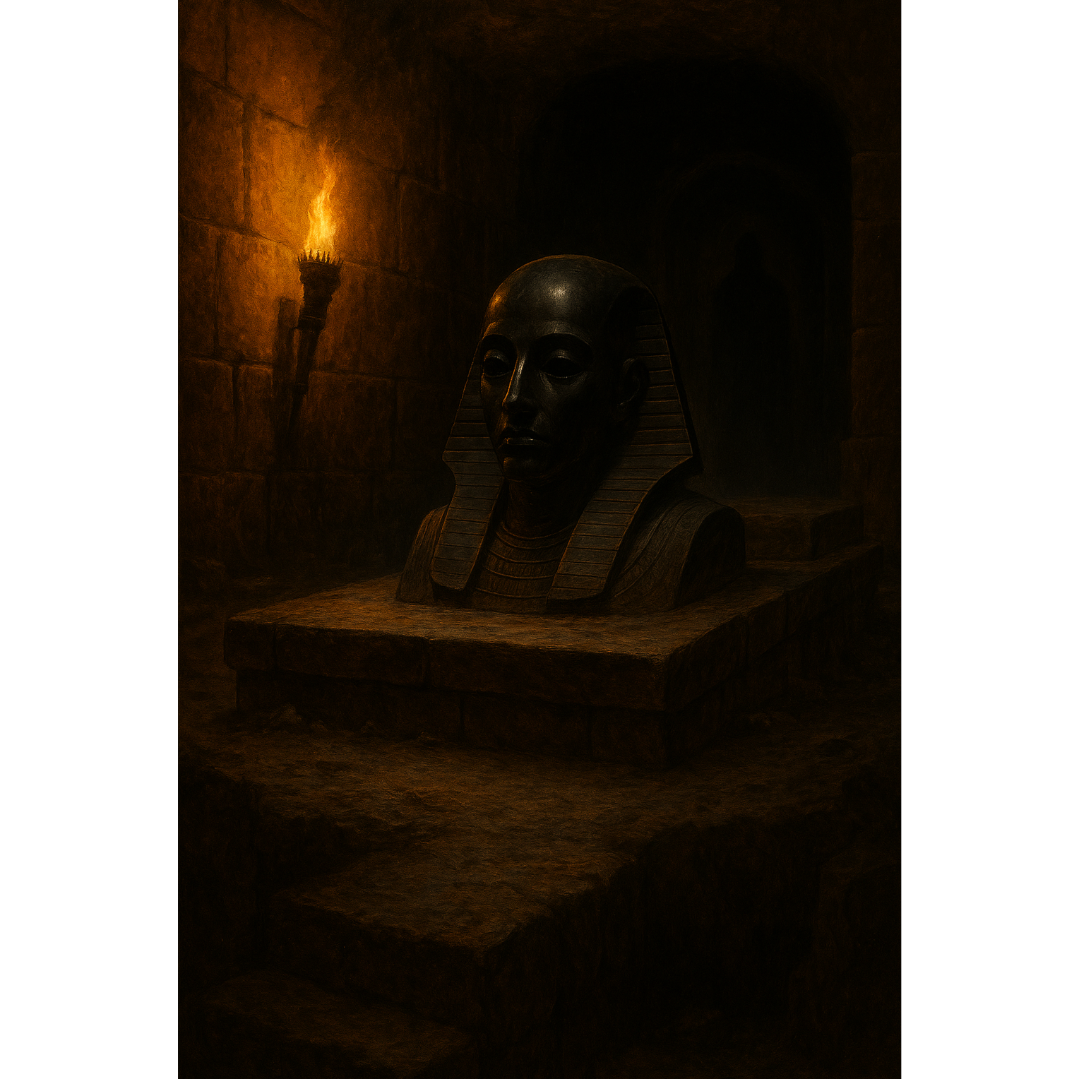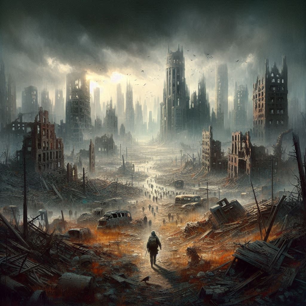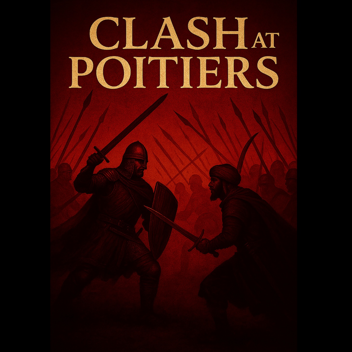 Dark, distorted guitar riffs drive relentless energy, shifting between crushing power chords and chaotic shredding solos, Thunderous double-kick drums pulse unpredictably, interwoven with Darabuka and Daf rhythms, adding rapid Eastern accents, Oud and Kanun melodies twist through the heaviness, shaped by eerie Maqam scales, A piercing soprano voice rises above guttural war chants, clashing with distorted battle cries, Echoed whispers and cinematic brass add grandeur, while violins cut through the destruction, After a brief silence, the final crescendo erupts, guitars roaring, trumpets blaring, and percussion spiraling into an unstoppable climax