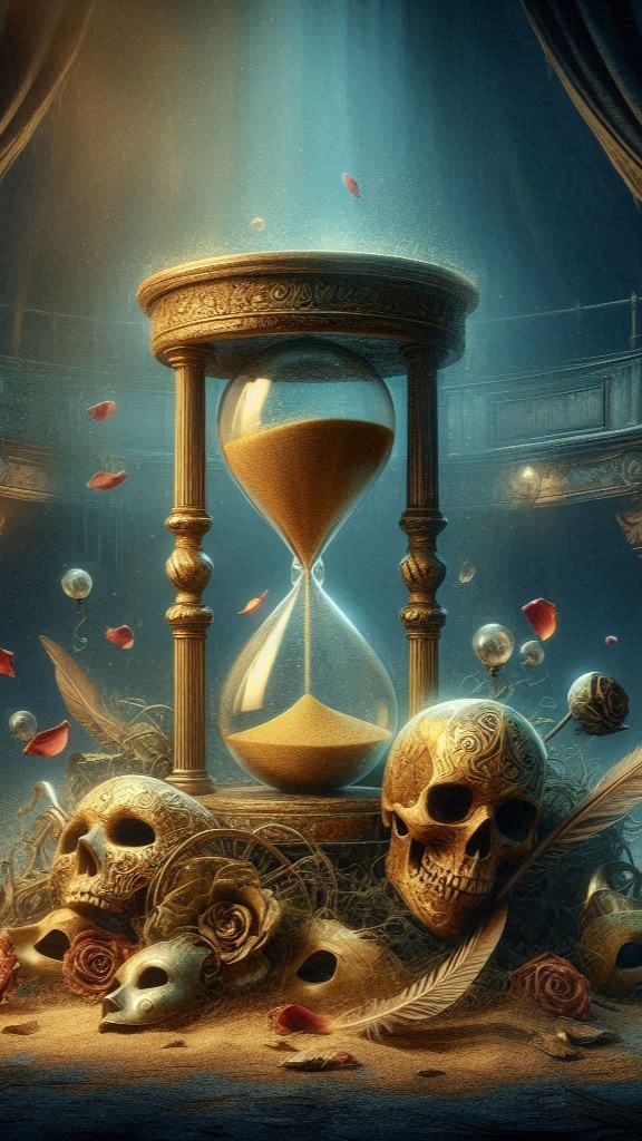 A theatrical metal track with a haunting, melodic edge, Guitars blend vintage crunch with minor-key riffs, shifting between atmospheric picking and expressive solos that erupt with emotion, Bass lines weave independently to enhance the drama, while drums maintain a brisk, shifting groove with tribal toms, syncopated fills, and restrained double kick bursts, Vocals are gritty and darkly melodic, shifting between whispered, narrative verses and soaring, hymn-like choruses, The vocal tone is raw and charismatic, with mid-range rasp, emotional breaks, and a theatrical edge — snarling in defiance, yet deeply human, Ghostly harmonies and occasional chants add sacred depth, Analog synths and organ textures build a mysterious atmosphere, especially in intros, bridges, and outros, The sound is moody, mystical, and emotionally rich — a sonic séance of illusion, possession, and revelation, ending in a slow, majestic fade that feels like legacy