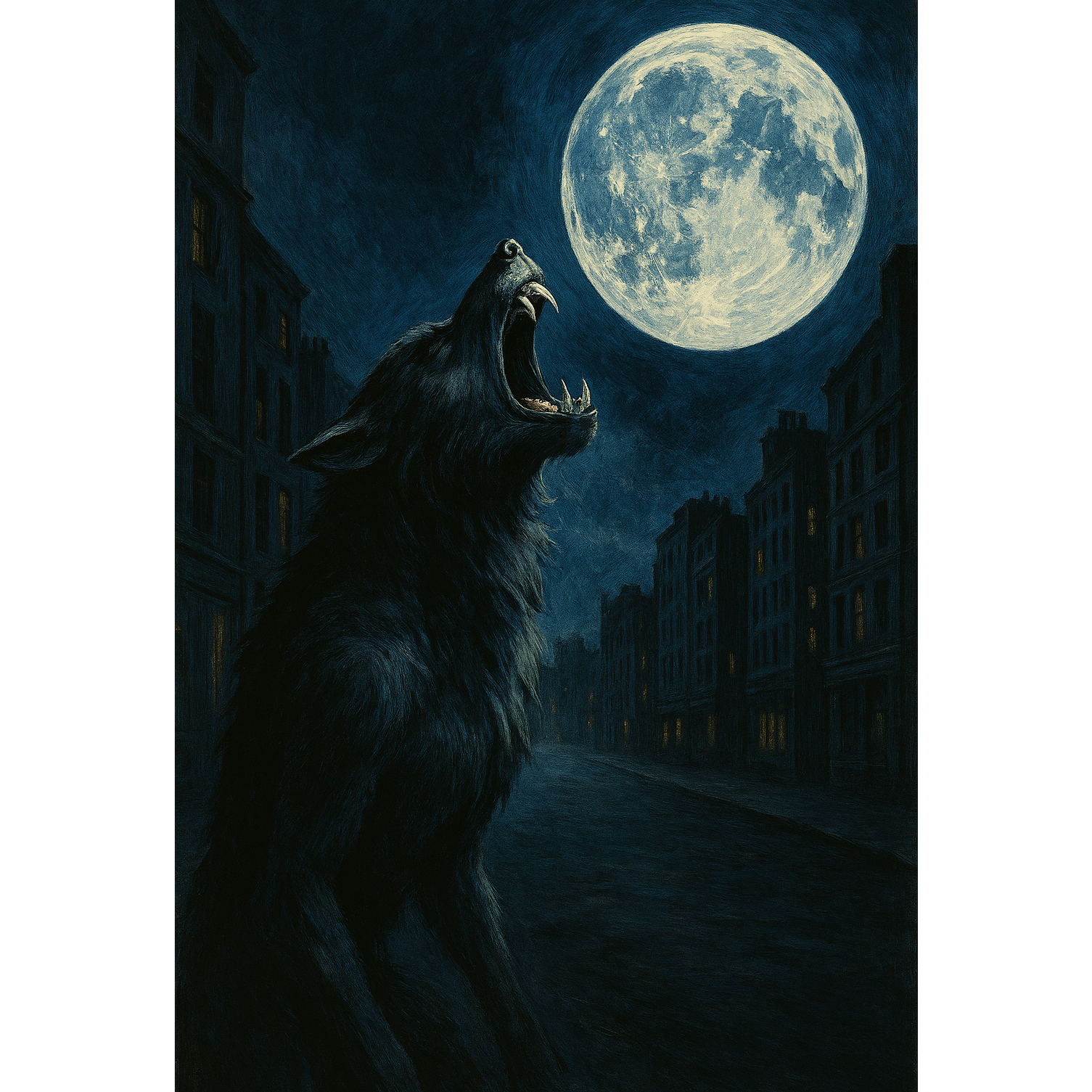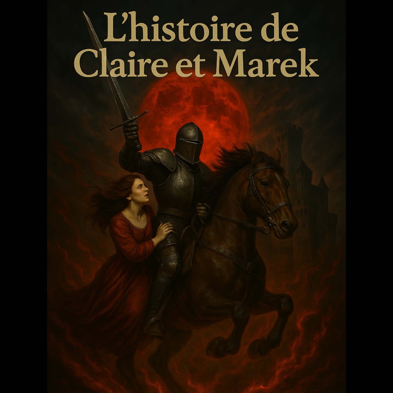 Tempo around 140 BPM—fast enough for speed-metal drive yet open for heavy, oppressive sections, Drums use double-bass sparingly, favor groove over blast beats, with off-beat accents and galloping rhythms, Guitars tuned to Drop D or C♯: palm-muted power chords, melodic leads, and theatrical vibrato solos, Amp settings: high gain, mid-scoop, and tight low end, Bass mirrors guitar roots with selective fills and slides to drive momentum, Drums sound crisp: fat snares, resonant toms, and punchy kicks, Guitars are underpinned by dark synth drones and reverb-soaked pads in verses, Horror FX (wolf howls, heartbeat) appear only at key transitions, Female vocals: clear, emotionally dynamic, no harsh screams, Expressive cracks and phrasing, with light reverb, gentle chorus, and occasional delay