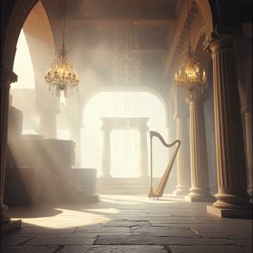 Ethereal fantasy orchestra, high strings harmonics, harp arpeggios, celesta sparkles, airy choir pads, slow evolving harmony, mystical and ancient, shimmering ambience, delicate but emotional