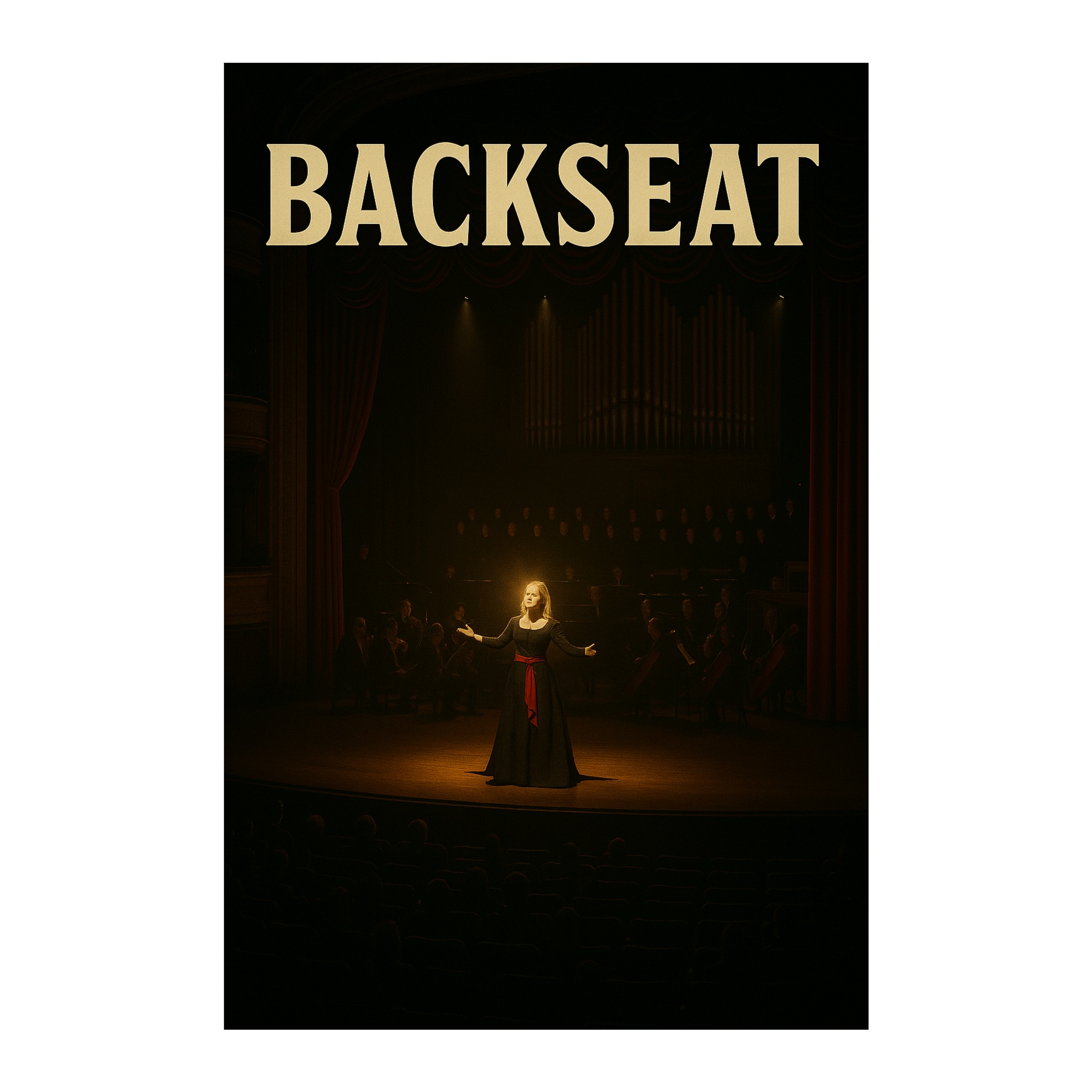 Broadway musical theater with dark theatrical power, 130 BPM, minor key, Expressive female lead vocalist with emotional delivery, backed by full orchestra, Dark strings, brass stabs, pipe organ base with dramatic tension, Piano foundation with key modulations and dynamic builds, Lead vocals crystal clear, supported by theatrical backing choir (3-part harmony), Verse: sparse orchestral bed, Pre-chorus: orchestral swell with strings and organ, Chorus: explosive full orchestration with choir and brass, Bridge: atmospheric orchestral break with glitchy synth artifacts blended with classical timbre, then dramatic return, Studio-quality production: polished yet dramatic, every lyric audible, Cinematic, emotionally gripping