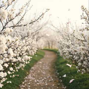 A gentle, romantic lo-fi tune inspired by a winding trail covered in blossoms, Soft nylon guitar plucks intertwine with airy synth chords, creating a delicate interplay between organic and electronic tones, The beat is light yet steady, like the slow rhythm of footsteps through a garden, Warm bass hums in the background, anchoring the melody without overpowering it, Occasional flute phrases float by like petals drifting on the wind, while faint bird calls and flowing water sounds add a natural touch, The atmosphere feels fresh, light, and quietly magical — perfect for studying, streaming, or simply getting lost in the gentle flow of sound, It’s the kind of track that makes time feel slower, encouraging the listener to savor every moment
