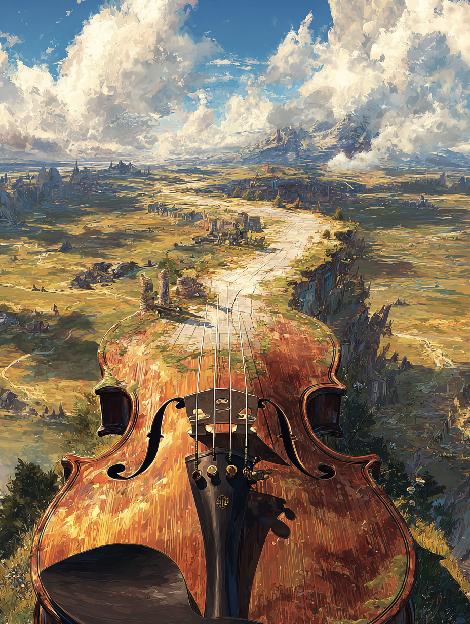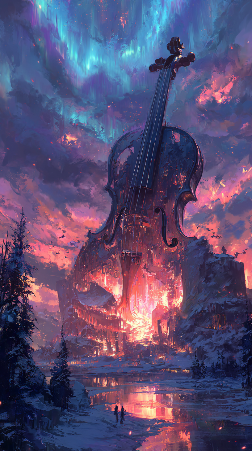 [expressive violin lead with warm vibrato, fluid legato arcs, and soaring high tones evoking auroral waves, supported by deep resonant bass like frozen ground, ]