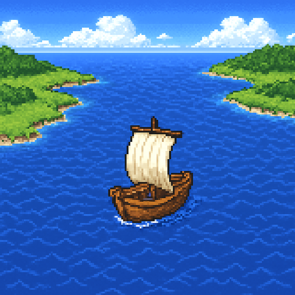 16-bit era fantasy RPG sea-travel theme, Bright, uplifting melody carried by crisp bell-like synths and warm square leads, Flowing arpeggios that shimmer like sunlight on waves, supported by gentle string pads, Light but steady snare and timpani accents giving a sense of heroic journey, Melancholic but hopeful harmony progression reminiscent of classic ocean overworld themes, Clear, refreshing atmosphere that evokes wind, horizon, and wide blue seas, ”