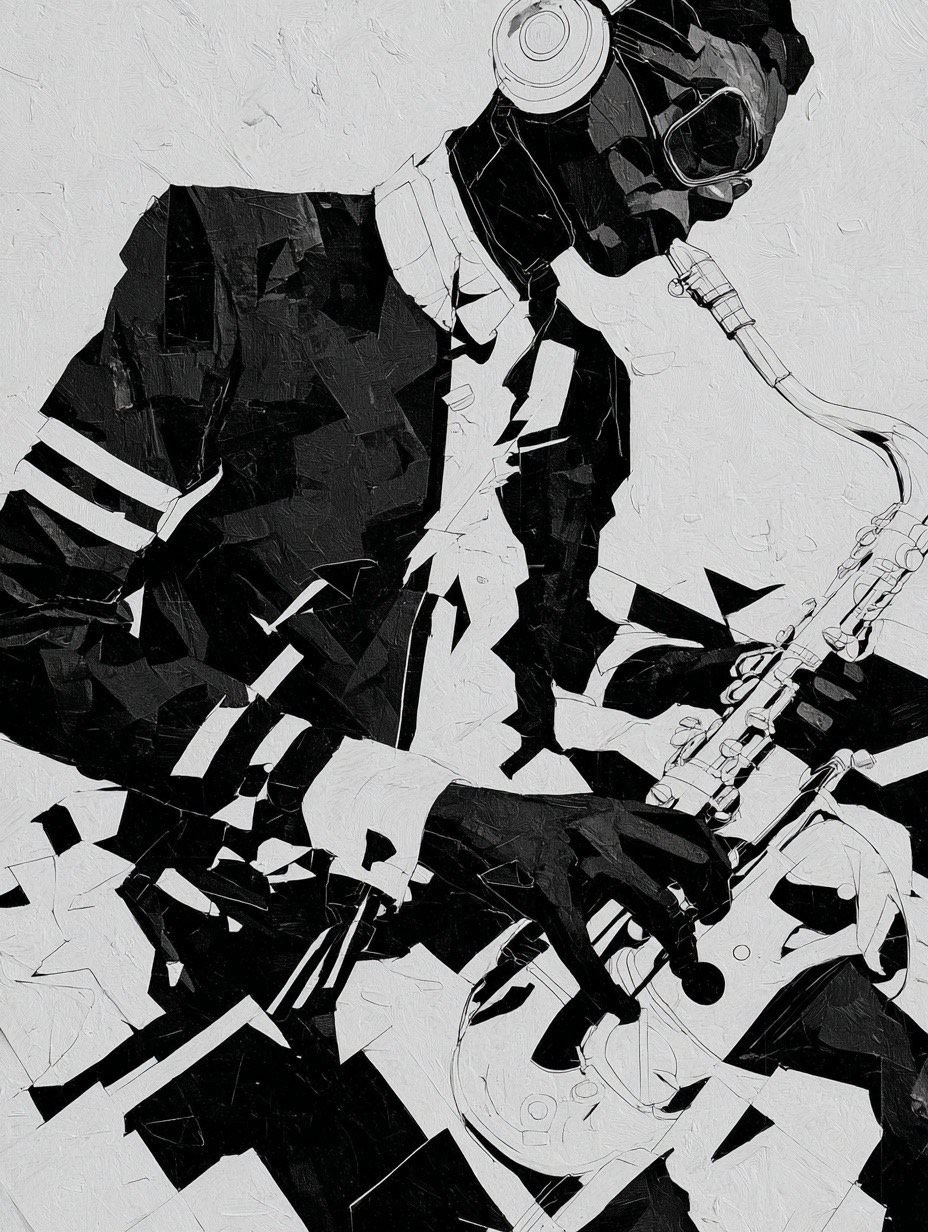 [Instruments: Sharp attack saxophone, hard mechanical breakbeat drums, metallic percussive textures, industrial ambience, granular noise layers]