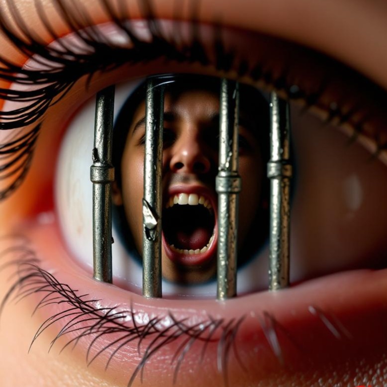 A collision of New Wave of British Heavy Metal with aggressive 808s, fusing heavy distorted guitars, crisp electronic textures, and pounding live drums with sharp hi-hats, Deep rap verses ride the groove, with atmospheric synths and pulsing bass waves soaring through each hook, On the bridge, strip down, unplug with clean electric accompaniment, and strong and tender moving vocal, Final phrase "But there's a mind behind these eyes