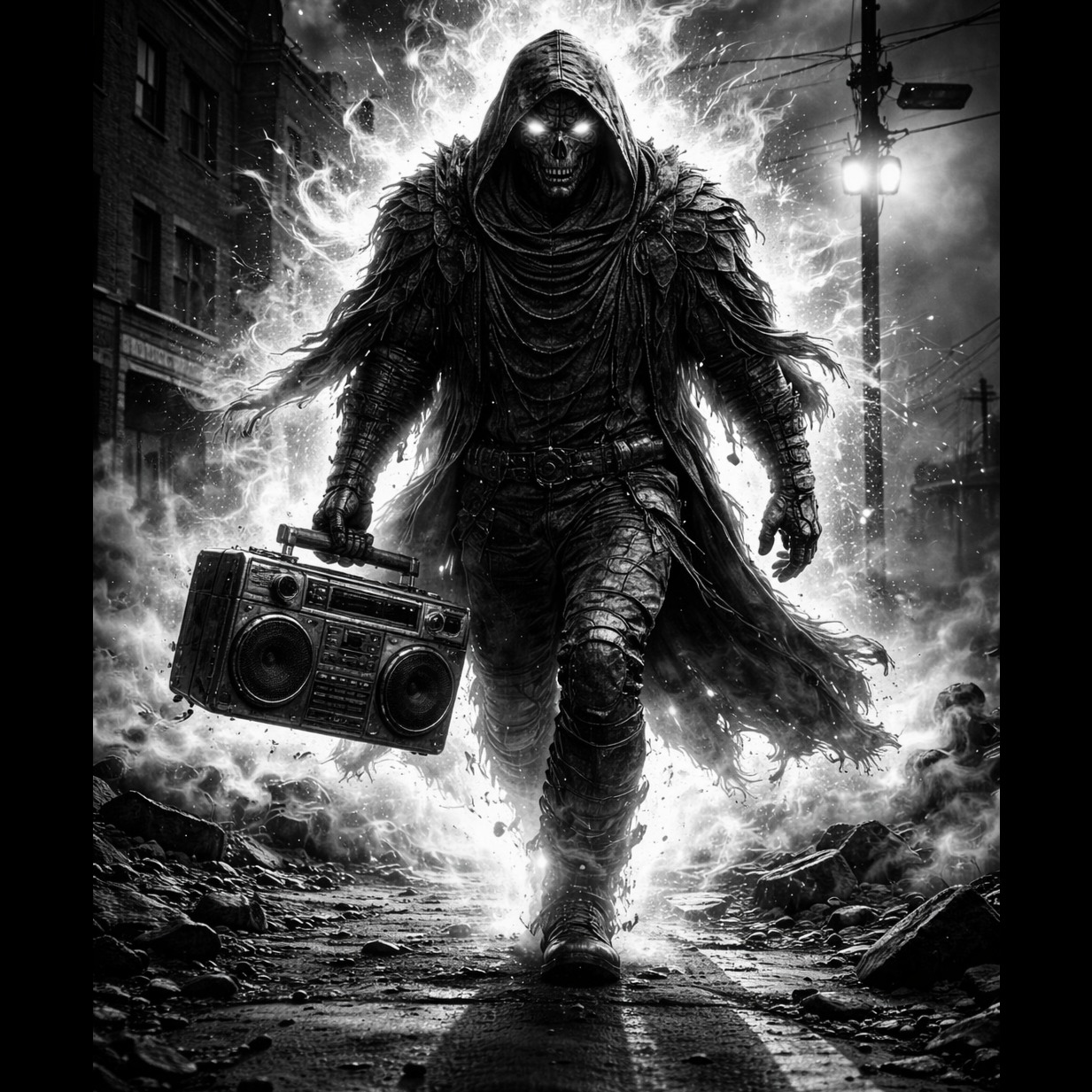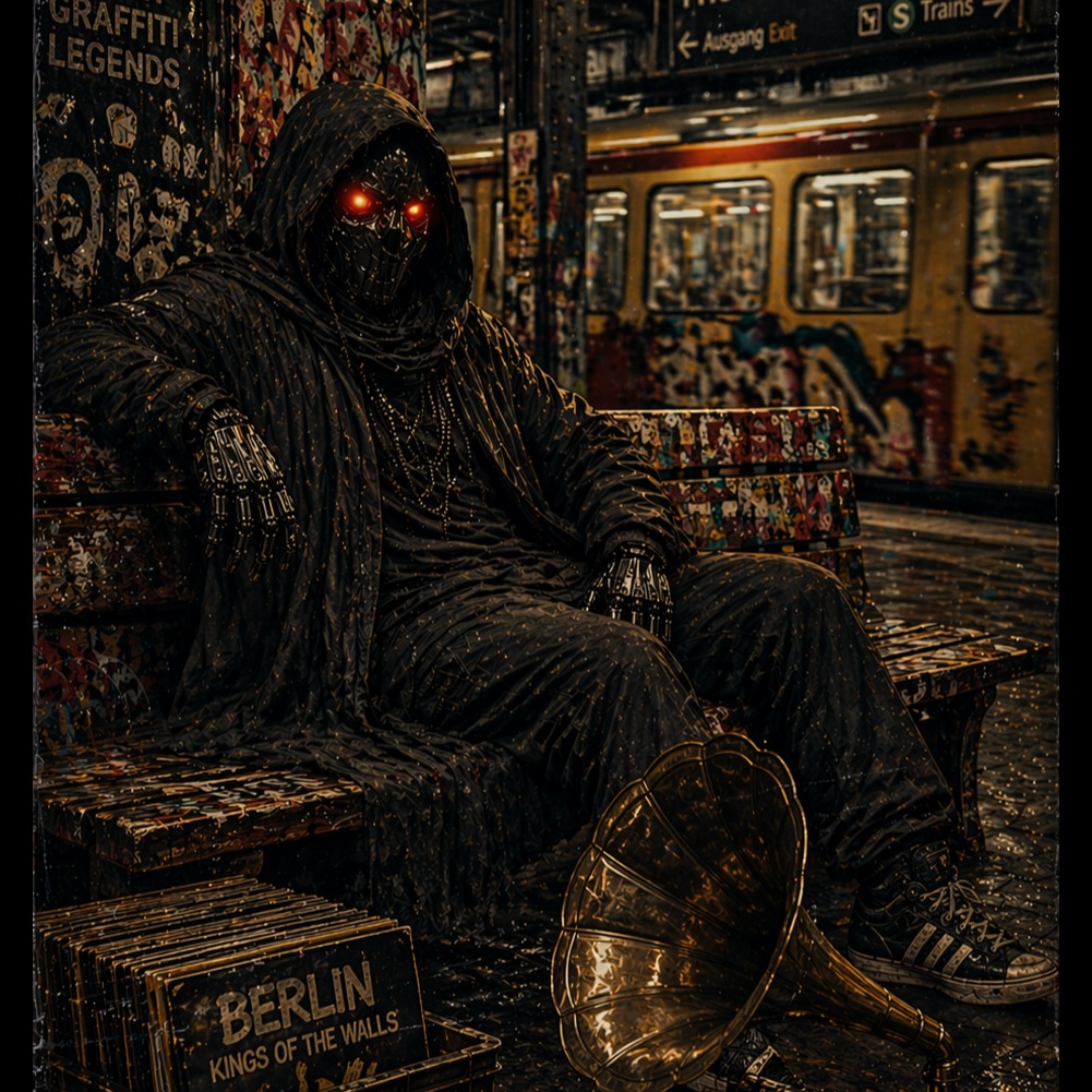 Berlin Graffiti Legends twisted in A forgotten 12-inch vinyl spinning in a dusty Grammophon, berlin crews battle over art, graffiti-splashed studio, instan golden-era vibe, city lights fading into night, Pure essence of uncompromised East Coast underground hip hop, dark and relentless urban narrative, raw street grit, Hard-hitting drum machine rhythms, punchy kick, snapping snare, intricate swinging hi-hats, deep hypnotic bass movement, Authentic 12-bit lo-fi sampling texture, heavy vinyl crackle, subtle tape hiss, analog warmth and saturation, Gritty soulful piano chops, haunting minor-key brass stabs, eerie string samples, deep melodic upright bass, Raw concrete jungle energy, crate digging soul, golden era vibe, mid-tempo groove, Cinematic street ambiance, distant car alarms, muffled subway rumble, High-fidelity unpolished sound, rugged poetic rhythm, hardcore vintage production, legendary boom bap signature, pure analog, just classic golden era instrumental