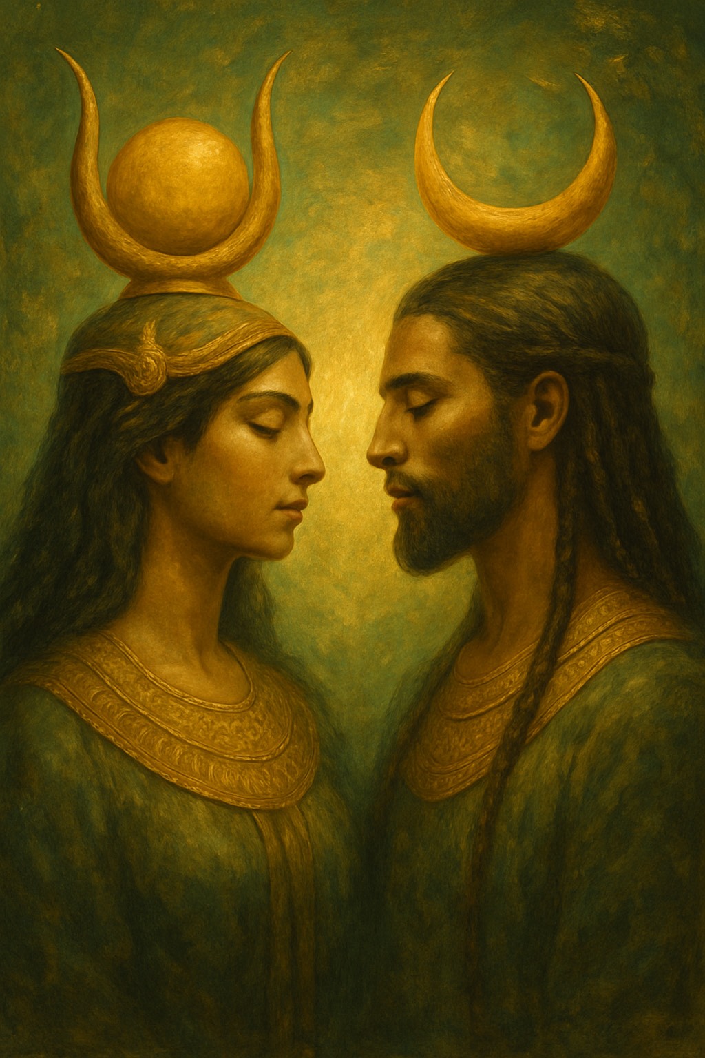Spanish spiritual song with melodic chant and poetic recitation, Male and female voices alternating — the woman sings in a mystical tone, the man speaks with warmth and depth, Inspired by Celtic spirituality: use harp, flute, acoustic guitar, ambient pads, strings, natural sounds (wind, water), The song is sacred and flowing, combining ethereal singing with reflective spoken passages, Theme: the sacred dance between masculine and feminine, and the return to union, Include lines like: