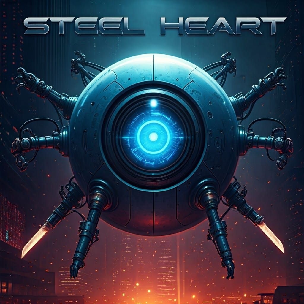 Industrial Metal, Dark Synthwave, Heavy metallic percussion, deep distorted bass, eerie synth pads, robotic vocals, screeching steel effects, reverberating mechanical clangs, slow, crushing drum hits