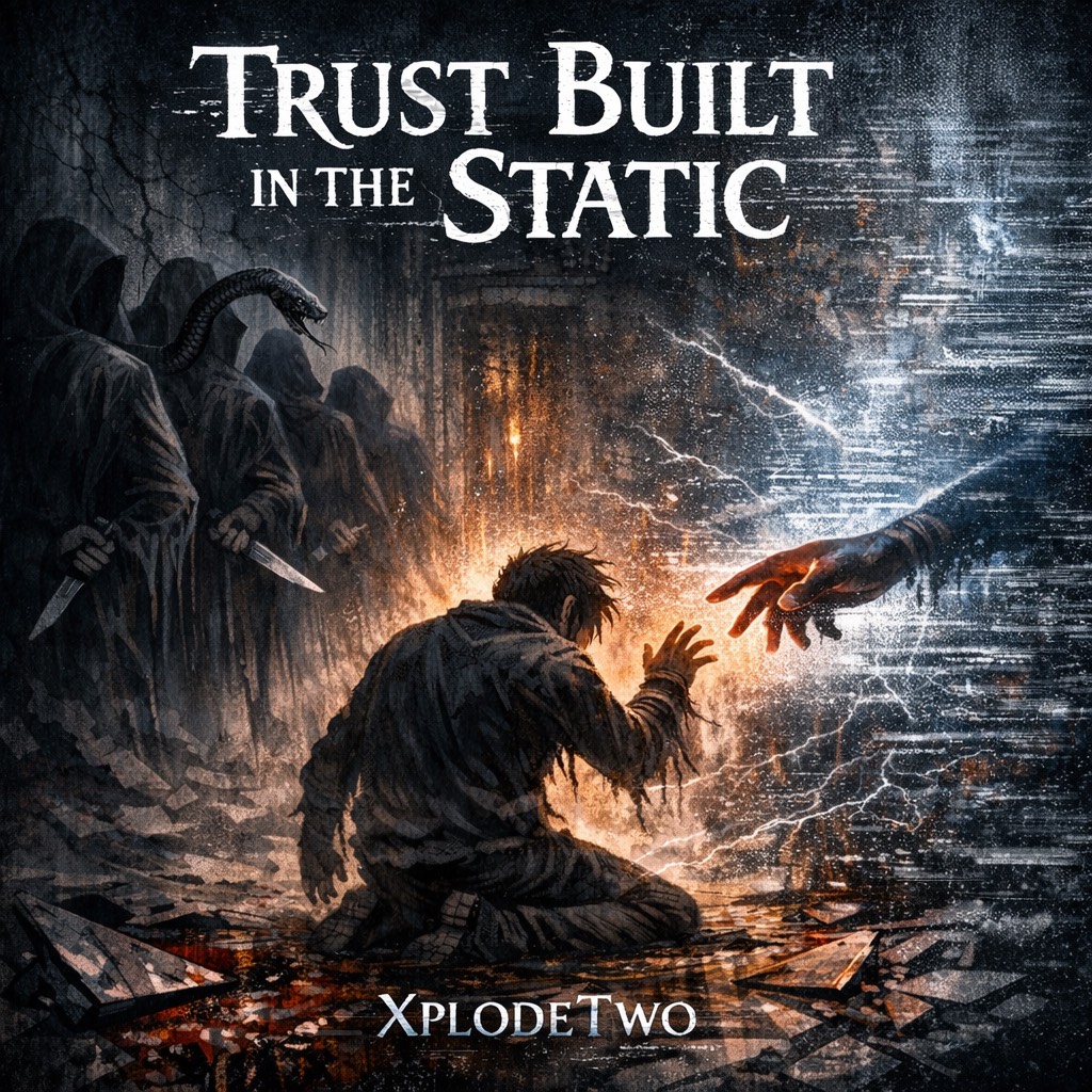 High-energy metalcore with soaring melodic choruses, drop-tuned guitars, and alternating harsh and clean male vocals, Verses drive on palm-muted riffs and double-kick bursts; choruses open into wide, anthemic chords, gang shouts, and bright lead lines, Bridge hits a half-time breakdown with ambient pads floating over chugs, then a final key-lift chorus with stacked harmonies