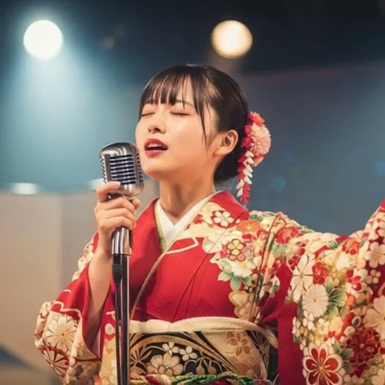 Traditional Japanese enka, Slow tempo, Minor key with dramatic chord changes, Shamisen, taiko accents, and rich string arrangements, Occasional instrumental fills between lines, Powerful female vocal, Clear enunciation, Wide dynamic range, Expressive kobushi and deep vibrato, Emotional climaxes in chorus, Classic enka stage performance atmosphere