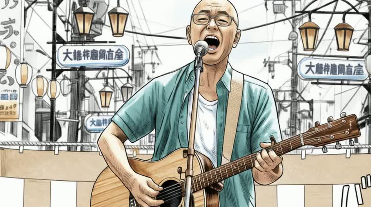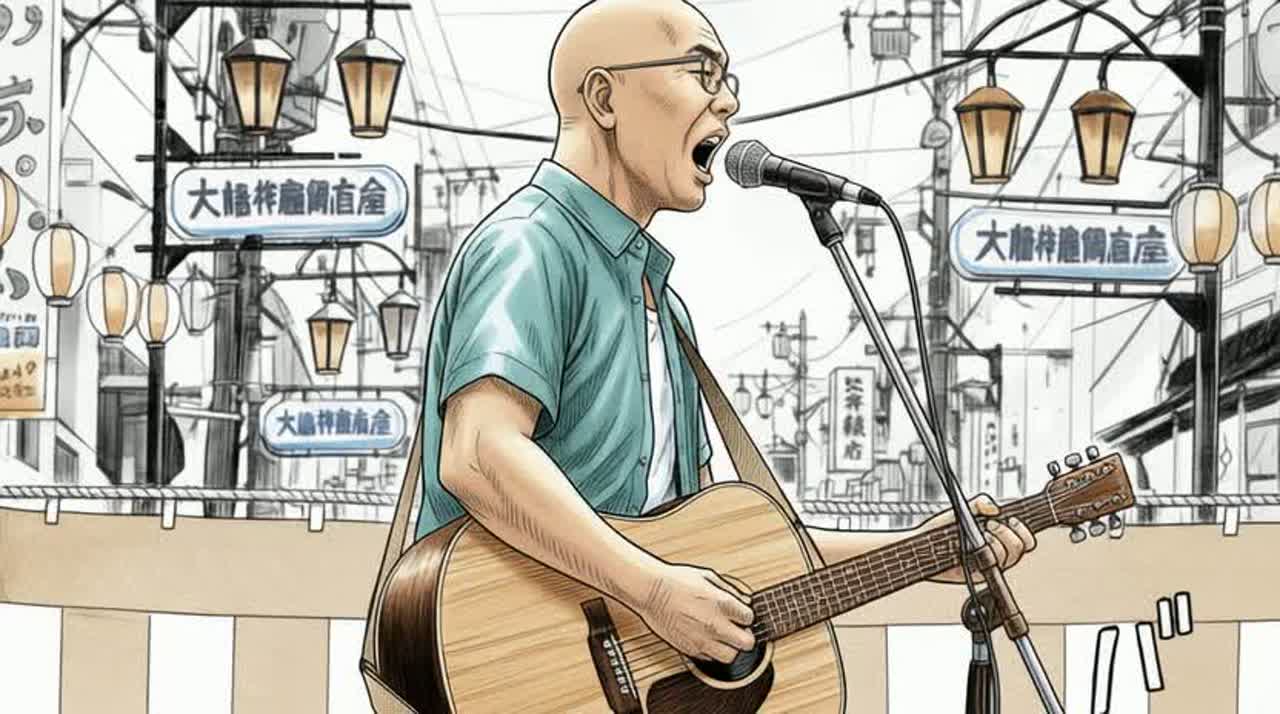 Key: G Major, Single acoustic guitar only, Japanese middle-aged male vocal, Rough, imperfect, emotional singing, Street performance vibe, No backing vocals, no scat