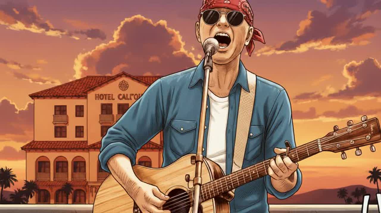 1970s West Coast American rock sound, Warm California country-rock feel, Steady mid-tempo groove, Clean electric guitars with gentle arpeggios, Light acoustic guitar strumming, Smooth melodic bass, Subtle live-style drums, no heavy effects, Husky, slightly raspy male vocal, Calm, reflective delivery, Natural phrasing with emotional restraint, A touch of weariness and warmth in the voice, Wide open night-road atmosphere, Sunset to midnight mood, Nostalgic, laid-back, and cinematic, Organic band sound, not polished, not modern