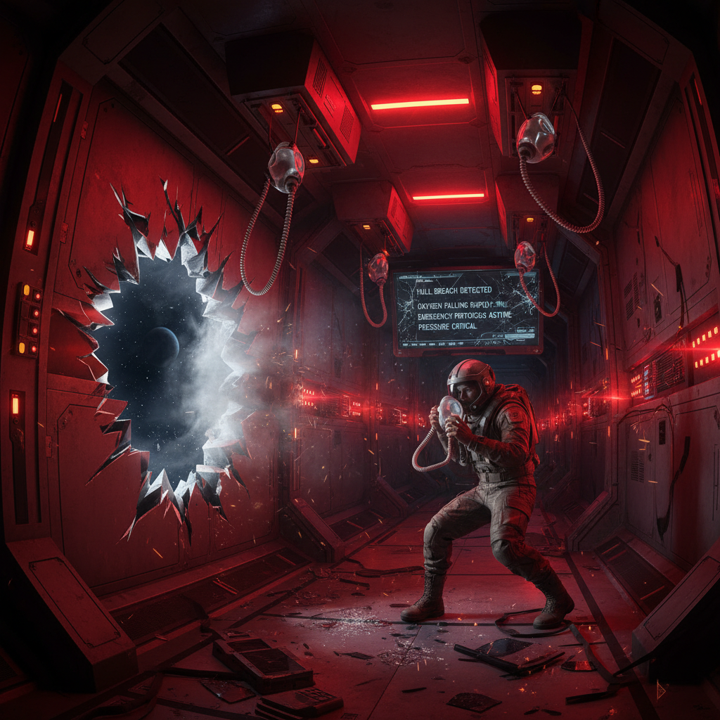Dark synthwave fused with space ambient and cinematic dark techno, The track is narrated entirely from the perspective of a stranded spaceship with a **female robot voice**, reporting **biological survival probability** and **ship system status/damage**, Spoken lyrics only, Anti-Drops and silence represent degradation, The voice is **clear, midrange emphasized, compressed, slightly glitchy**, intelligible over sub-bass and drone, Duration ~6 minutes, outro fades cleanly, ‑EDM, ‑big drops, ‑uplifting melodies, ‑catchy hooks, ‑pop vocals, ‑rave energy, ‑major key, ‑harmonic leads, ‑emotional payoff
