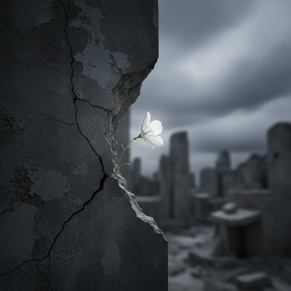 Style: Dark indie alternative with a focus on warm mids; moderate tempo around 70 BPM; rich analog synths and warm electric guitars; deep but balanced bass; punchy yet controlled drums with vintage-style snare; intimate and raw atmosphere; subtle distortion and tape saturation adding grit; spacious but warm reverb, less airy and more grounded; emotional and slightly rough mood balancing vulnerability and strength, Vocals: Deeper, slightly husky and raw tone; breathy but with grit; intimate close-mic delivery; restrained vibrato; moderate warm reverb with mild saturation/distortion for roughness; subtle stereo delay; vocals sit warm and centered in the mix; expressive with a rugged emotional edge