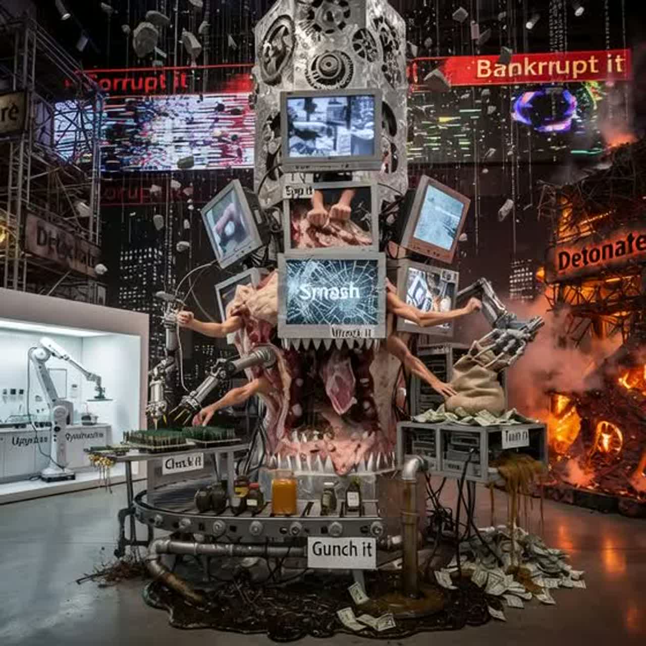 Opening with eerie ambient textures, distant metallic clangs, and distorted music box melodies, the track unfolds with pounding industrial drums and weighty, glitched bass growls, Female vocals contort between lullaby whispers and manic, demonic roars, Layers of cinematic synths heighten the horror, with frantic rhythmic drops in deathstep style propelling chaos, shifting between melodic passages and jarring insanity, The outro retreats into unsettling, minimalist ambience