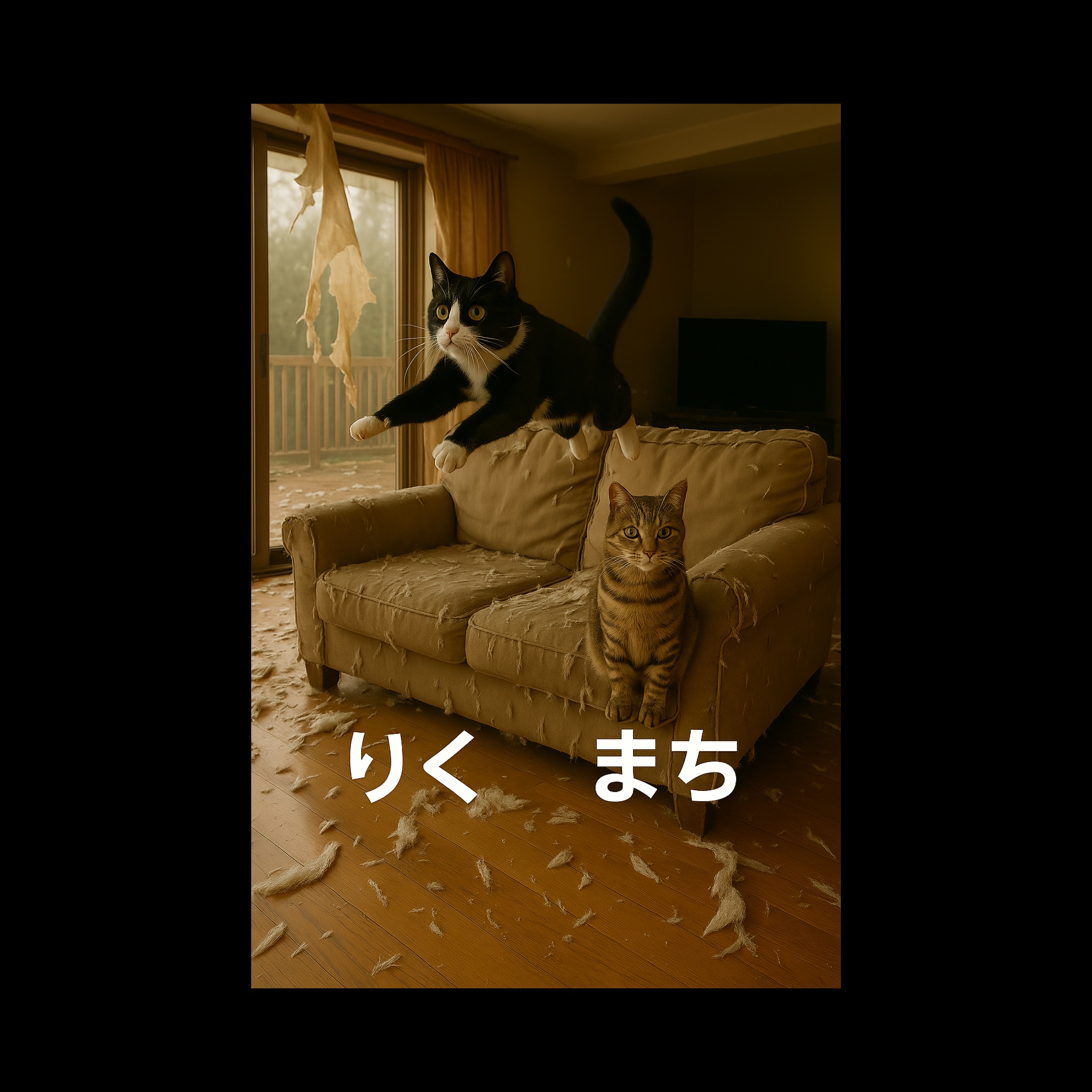 A high-energy, playful Japanese punk rock song with fast-paced distorted electric guitars, punchy drums, and a raw, spirited vocal delivery, The mood is chaotic, fun, and slightly rebellious, reflecting the daily antics of two mischievous cats who destroy their home but are still beloved, Include dynamic changes and shout-along chorus parts, Vocals should have character — a mix of attitude, humor, and affection, The tone is lively and chaotic, but full of heart