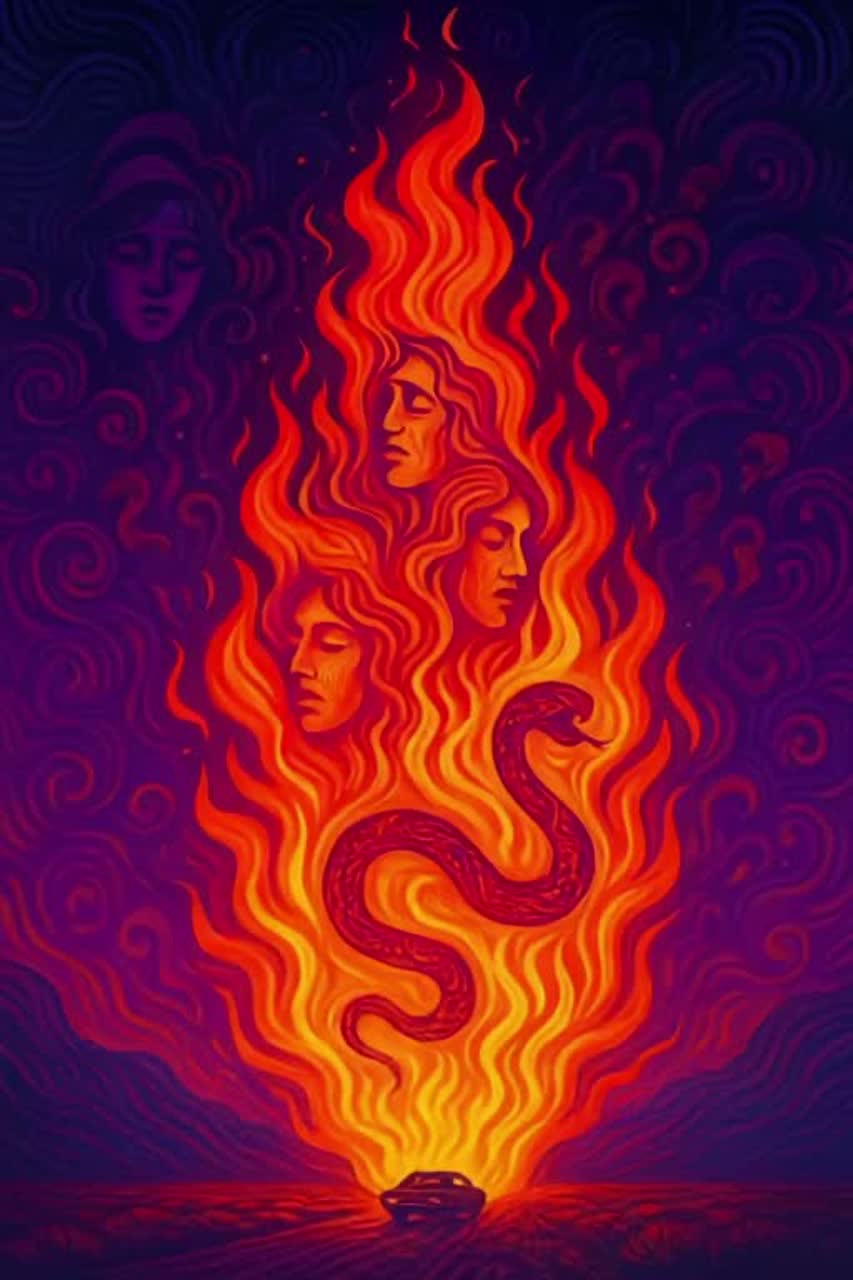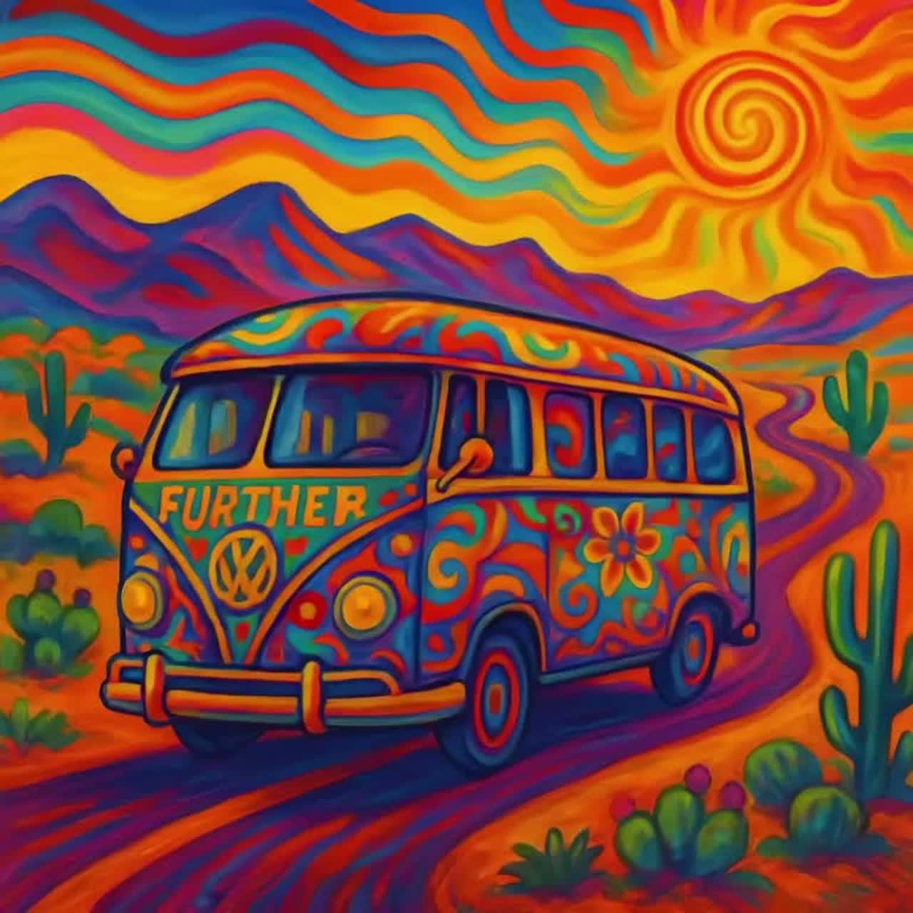 Psychedelic rock with swirling fuzz guitars, wah-wah solos, backwards tape effects, reverb-drenched organ, echoing sitar drones, hypnotic bass groove, tribal toms, layered vocal harmonies fading in and out like whispers, experimental synth textures, tempo shifts, surreal soundscapes, chaotic feedback bursts, dreamy atmospheric breakdowns, kaleidoscopic stereo panning