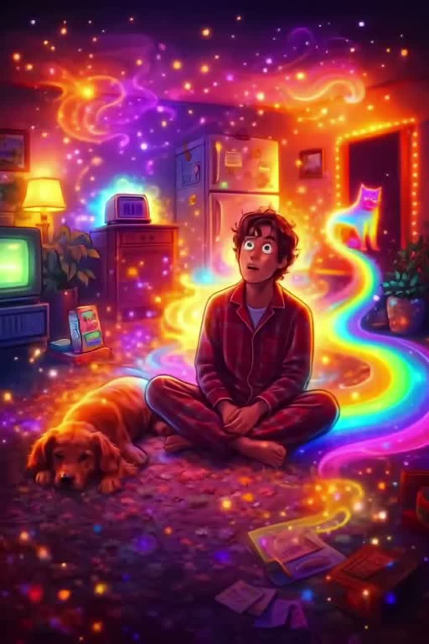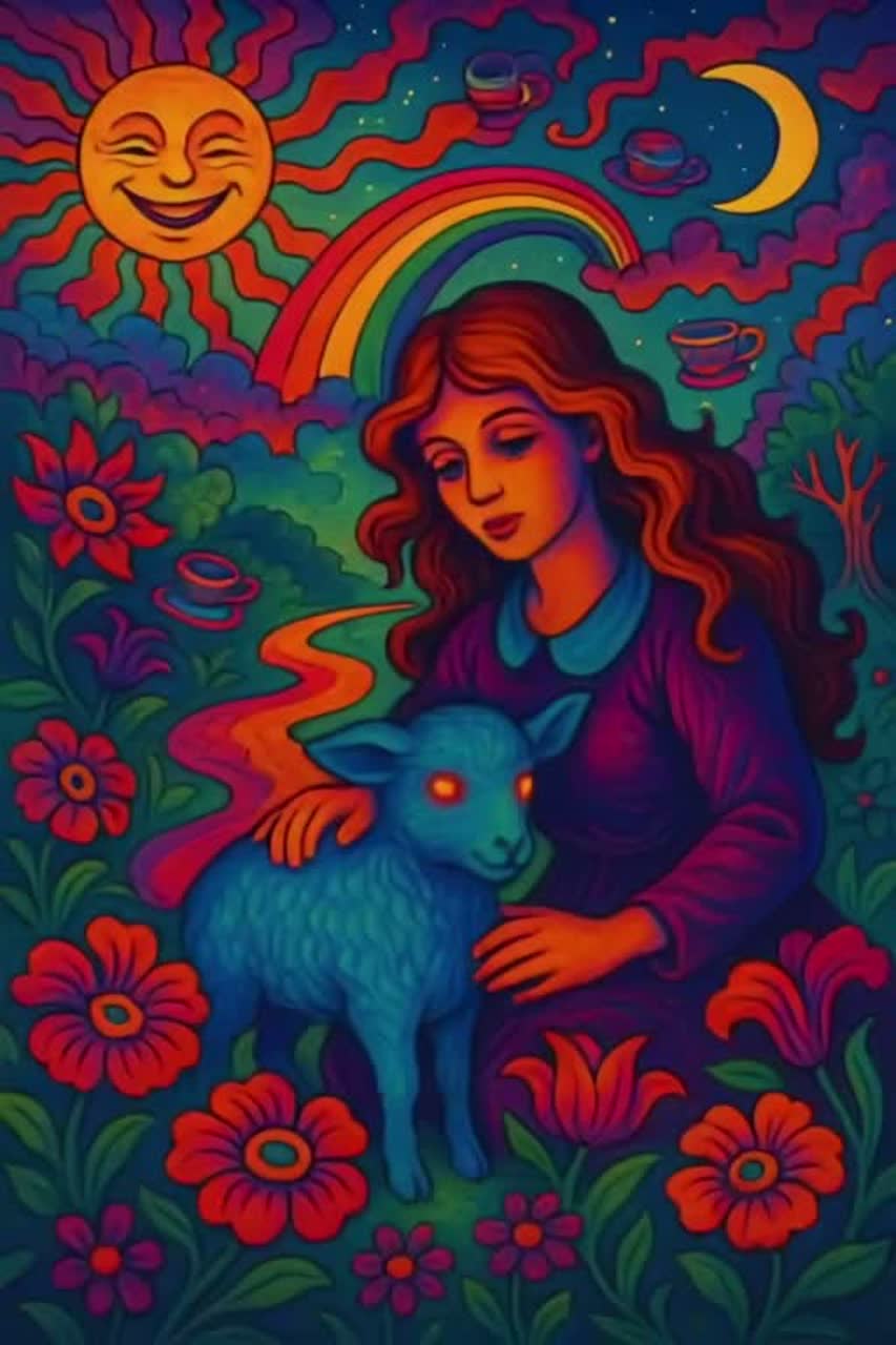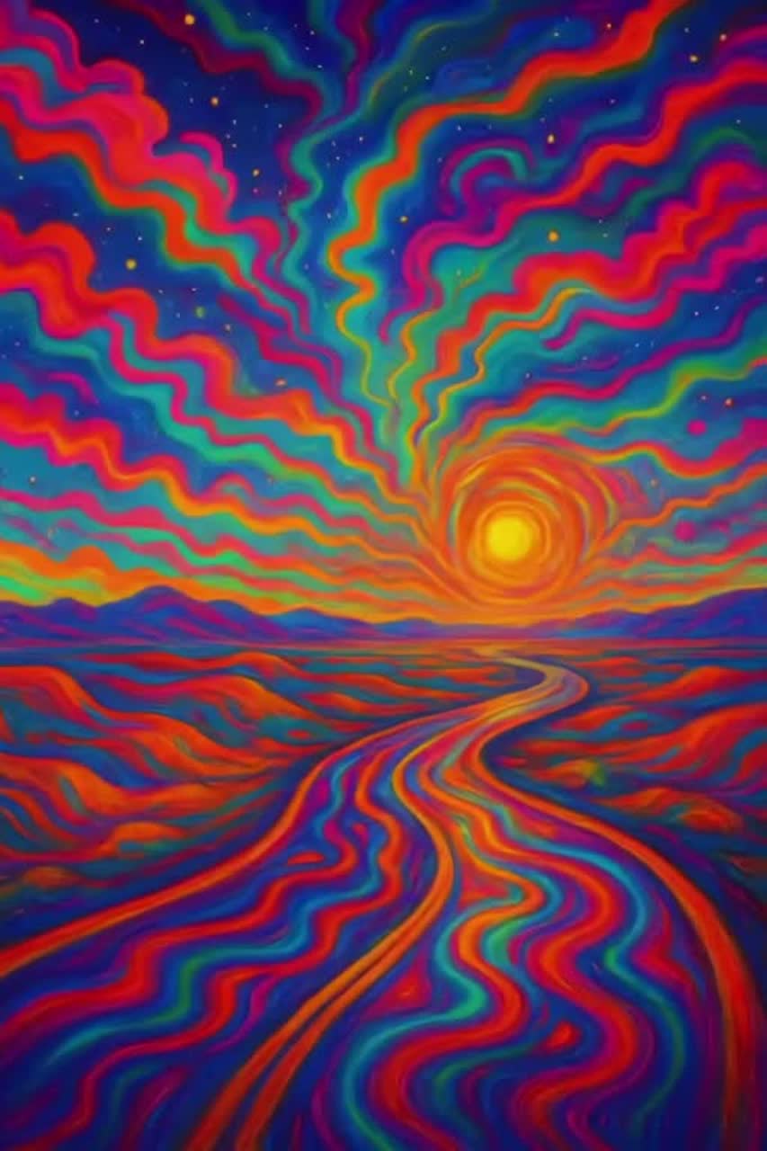 Surreal psychedelic dreamscape of sound, melting reality into rhythm, Echo-drenched vocals drift through cosmic reverb, Warped guitars shimmer like liquid glass, Pulsing analog bass throbs beneath swirling synths and backward chimes, Tempo bends, colors pulse, time ripples, Feels like driving through a hallucination — the road breathing, the sky whispering, the self dissolving into electric freedom, Cinematic, poetic, kaleidoscopic, strange yet beautiful