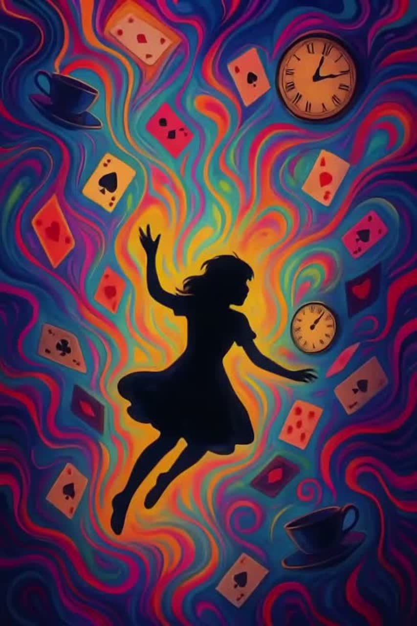 Psychedelic rock ballad with dramatic female lead vocals in a hypnotic, commanding style, Spanish-tinged electric guitar arpeggios in a minor key, steady repetitive bassline, and marching snare drum rolls that build intensity throughout the song, Psychedelic organ swells, echo effects, and reverb-heavy guitar create a dreamlike, surreal atmosphere, The arrangement crescendos from quiet and mysterious verses to a powerful, soaring climax in the chorus and bridge, Tone is mystical, surreal, and commanding, with lyrical imagery inspired by Alice in Wonderland