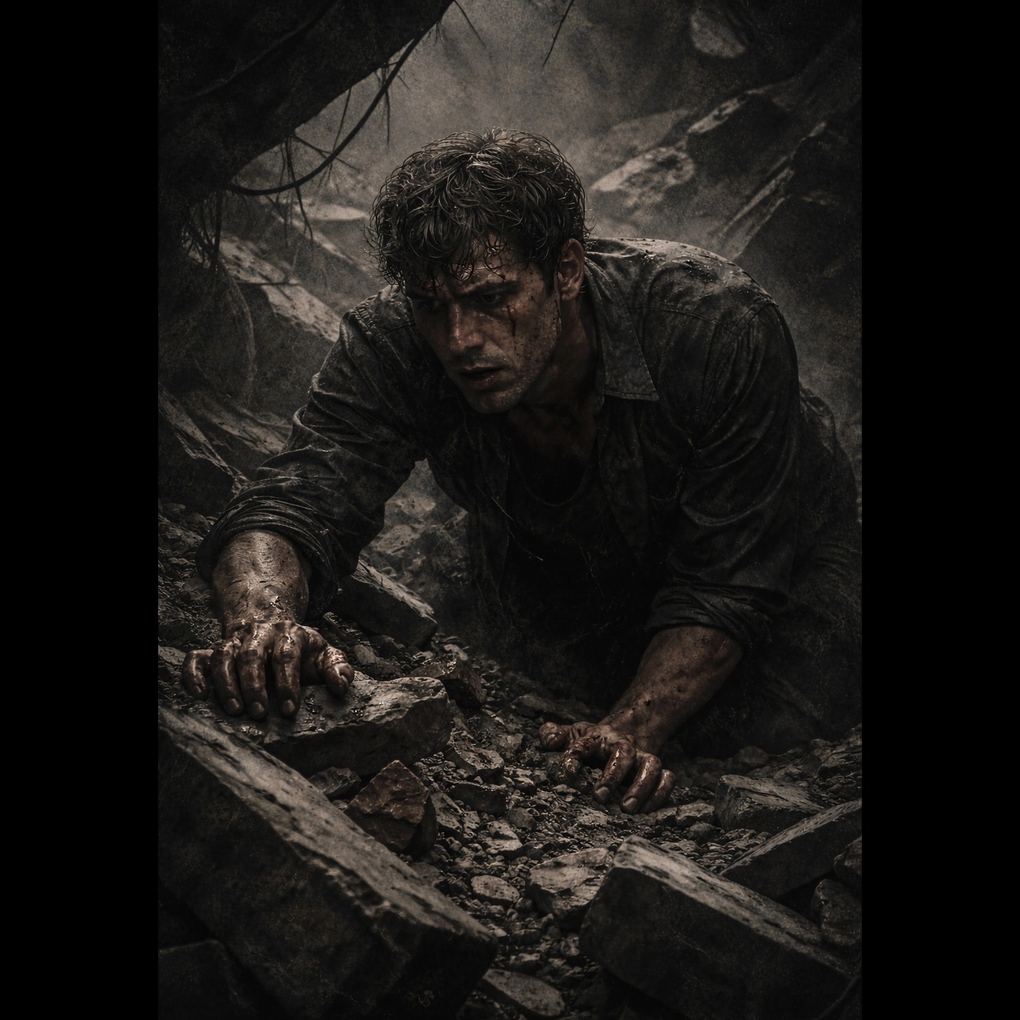 Gothic rock, post-punk, experimental art rock, atmospheric and theatrical, with a deep, haunting, and poignant baritone voice, The tone is dark yet strangely resilient, like a survival under emotional chaos, A dynamic build-up, an analog warmth, a clear electric guitar with subtle modulations, a deep melodic bass, organic drums evolving from a minimal pulse to a full rhythm, dominated by toms, multiple haunting guitar layers with feedback and echoes, a cinematic, introspective, and slow-burning atmosphere, both dark and luminous, a melancholic mood, dramatic spoken verses, and an intense melodic chorus, Production: fluid transitions, strong dynamic contrast, immersive and breathing mix, cinematic depth